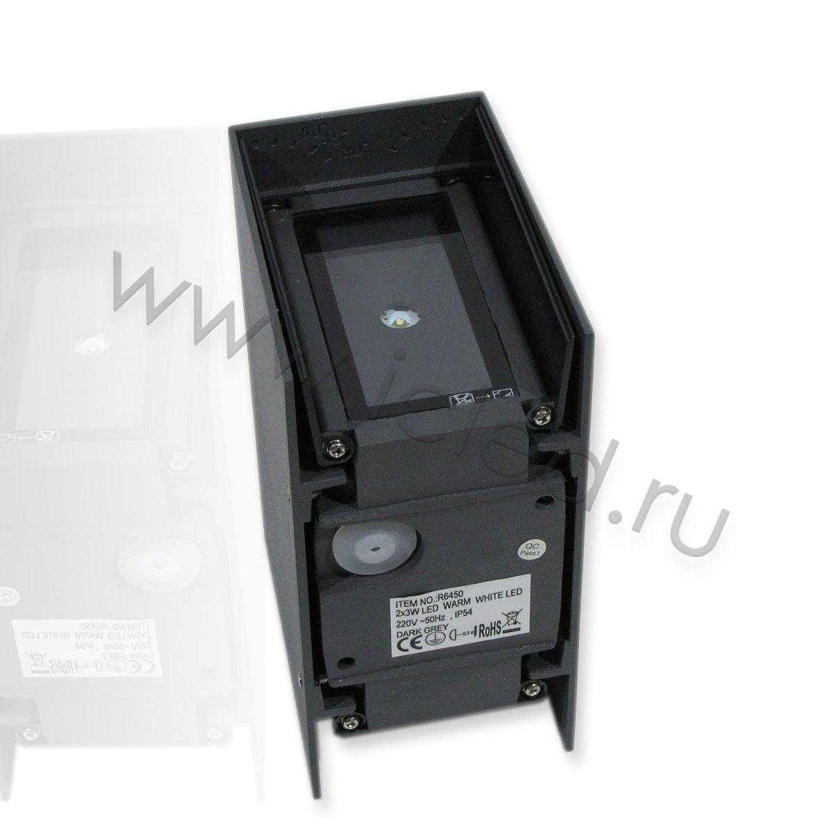 Светодиодный светильник двухлучевой с изменяемыми углами свечения 0-90 градусов. Серый корпус. Входное напряжение AC 100-240 V , светодиоды 2 х 3W COB CITIZEN, цвет свечения теплый белый 3000К, световой поток 600 lm, коэффициент CRI >85, класс защиты IP54, материал штампованный алюминий. Размеры ширина 50 мм, высота 172 мм, глубина 108 мм.