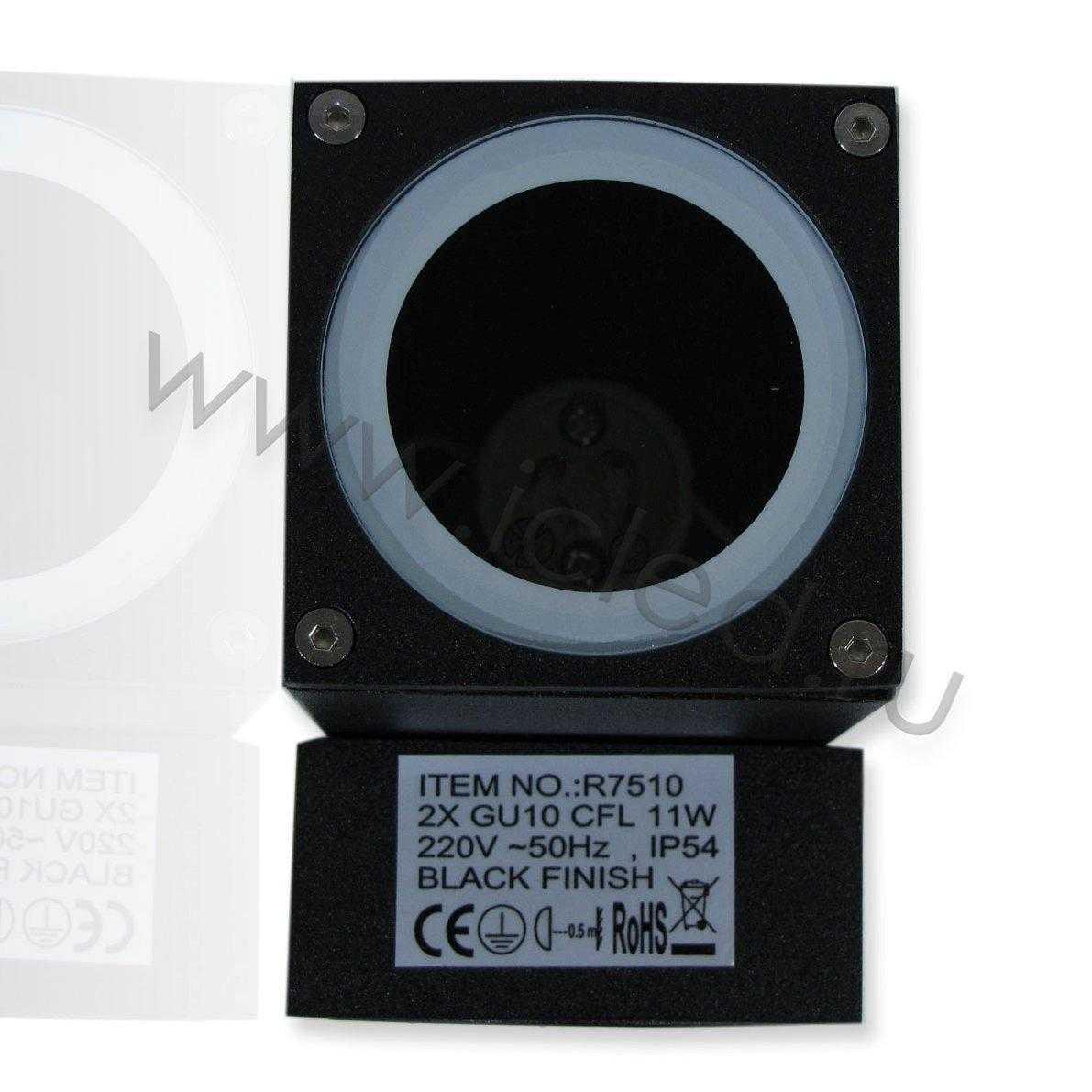 Светильник прямоугольный двухлучевой. Корпус анодированный черный. Входное напряжение AC 100-240 V, цоколь GU10 2 штуки для установки светодиодных ламп до 9W, энергосберегающих ламп до 11W, галогенных ламп до 50W, класс защиты IP54, материал алюминий. Размеры ширина 63мм, высота 202 мм.