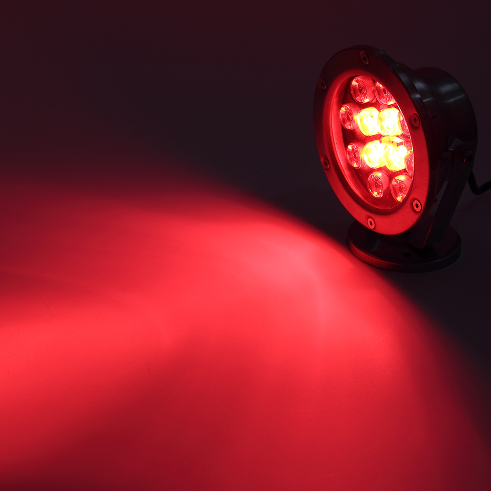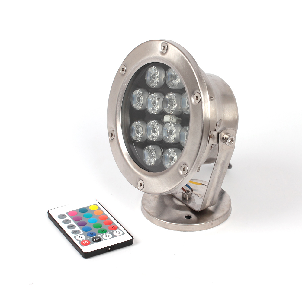 Светодиодный светильник. Входное напряжение AC 85-265V , светодиоды 12 х 1W (4шт. синих, 4шт. красных, 4шт. зеленых), цвет свечения RGB, с ИК пультом 24кн., угол свечения 30 градусов, класс защиты IP65, материал нержавеющая сталь. Высота 160мм, диаметр 143мм. Установочный диаметр площадки 89мм. Размеры упаковки 165х110х185мм. Вес 780г.