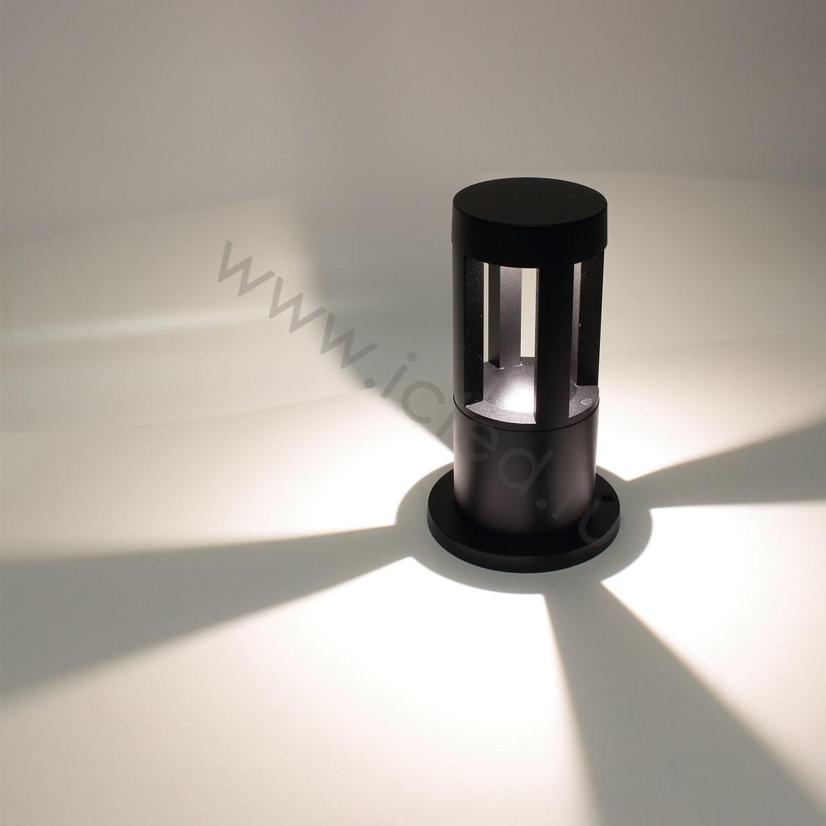 Светодиодный светильник уличный. Корпус цилиндрический черный матовый алюминиевый. Входное напряжение 85-265V, цвет свечения теплый белый 3000-3500К, мощность 7W, световой поток 700lm, угол свечения 120 градусов, класс защиты IP65. Коэффициент цветопередачи >80. Диаметр светильника 110мм, высота 260мм, диаметр основания 150мм. Вес 1250г.