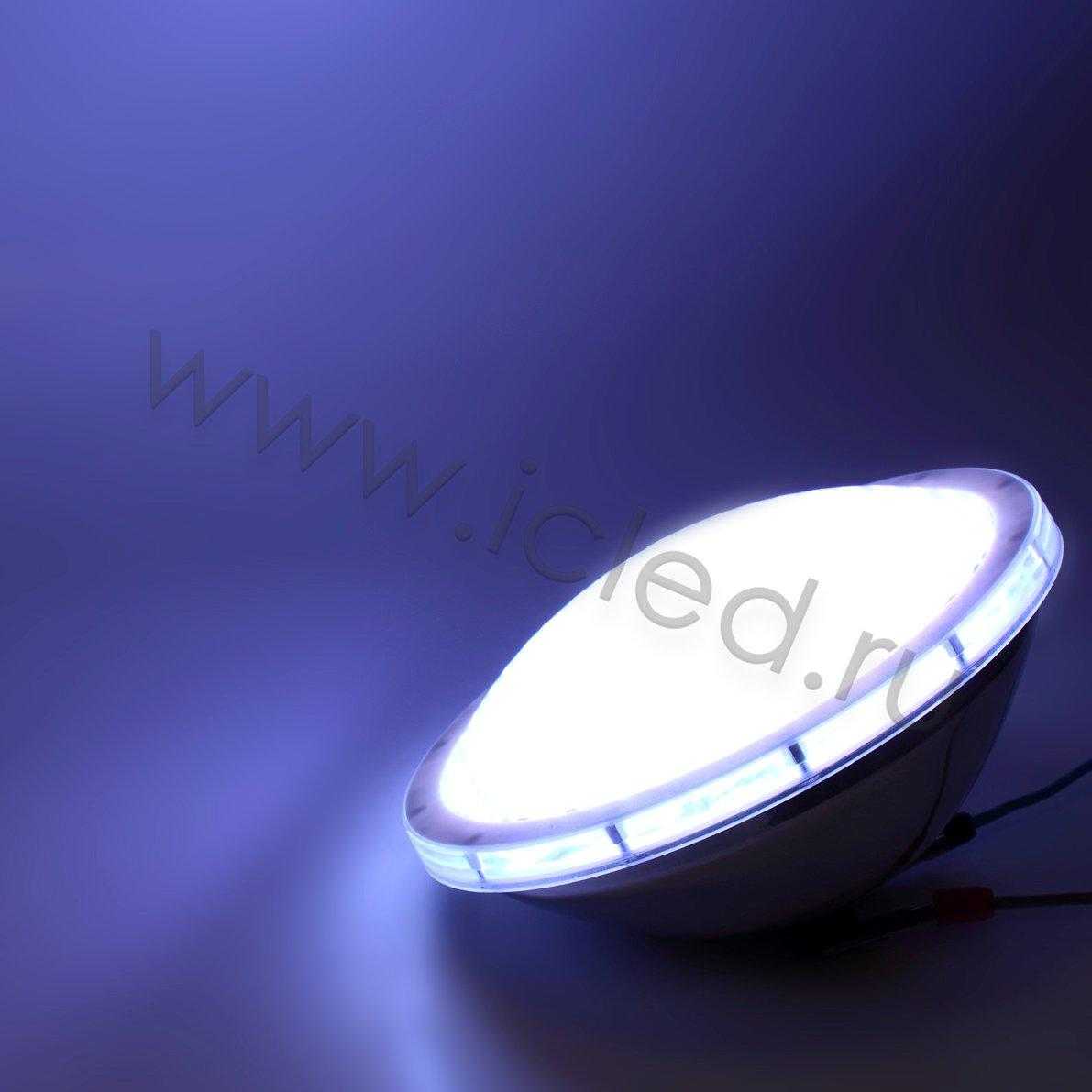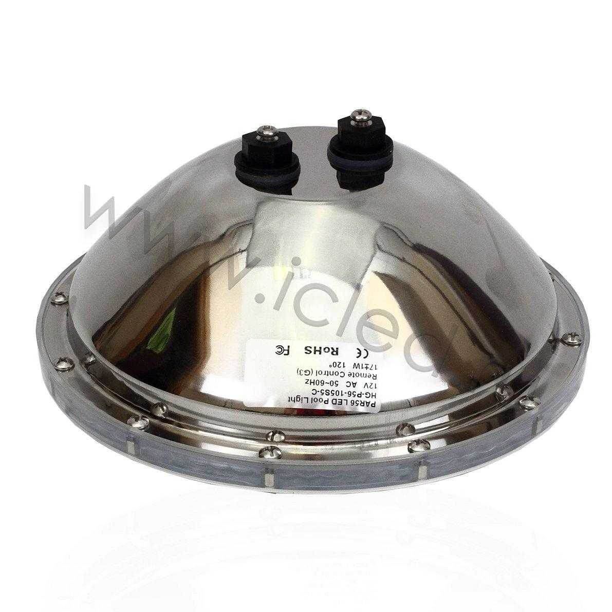 Светильник для бассейна PAR56. Корпус из нержавеющей стали 316. Класс защиты IP68. Цвет свечения RGB, напряжение AC12V, мощность 18W, угол свечения 120 градусов. Диаметр 177мм, высота 105мм. Вес 950г.