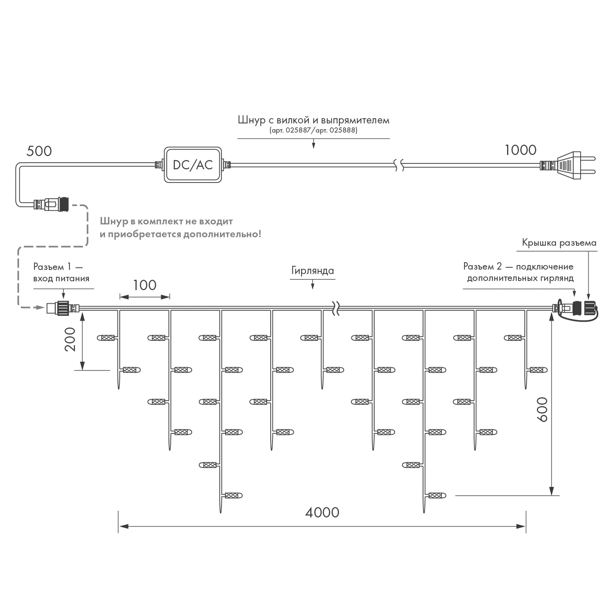 Универсальная светодиодная гирлянда "БАХРОМА" серии Pro отлично подходит для украшения и создания праздничной атмосферы как внутри помещений, так и снаружи (степень пылевлагозащиты IP65 позволяет размещать гирлянду на улице под навесом). Имея размеры 4000 x 600 мм, она может использоваться для оформления средних и больших площадей. Универсальные соединительные разъемы позволяют наращивать длину до 50 м без использования дополнительных аксессуаров. Выпуклая молочно-белая линза и эффект непрерывного свечения обеспечивают мягкое, спокойное и равномерное освещение украшаемых объектов. Теплый белый свет помогает создать необходимую атмосферу для декоративного объекта. Провод изготовлен из резины и окрашен в черный цвет. Аксессуары для подключения гирлянды к сети приобретаются отдельно.