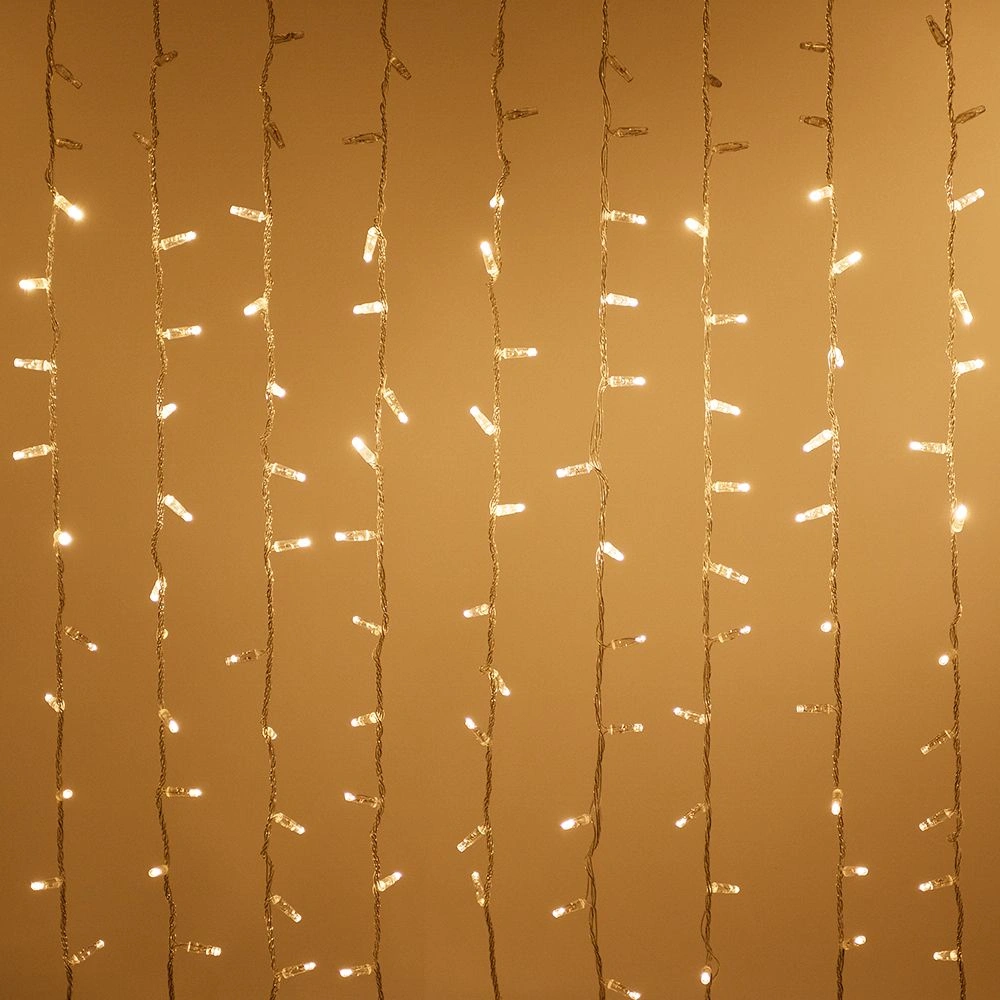 Светодиодный занавес Classic. Размер 2000x9000 мм (длина 2000 мм, высота 9000 мм). 20 ниспадающих нитей длиной 9000 мм. Цвет светодиодов ТЕПЛЫЙ БЕЛЫЙ (3000 К), динамический эффект "водопад". 2200 светодиодов размером 7 мм с резким световым рисунком (прозрачная вогнутая линза). Провод прозрачный, ПВХ. Питание 230 В, Мощность 180 Вт, защита IP65, применение в помещении и на улице под навесом. Аксессуары для подключения в комплекте.