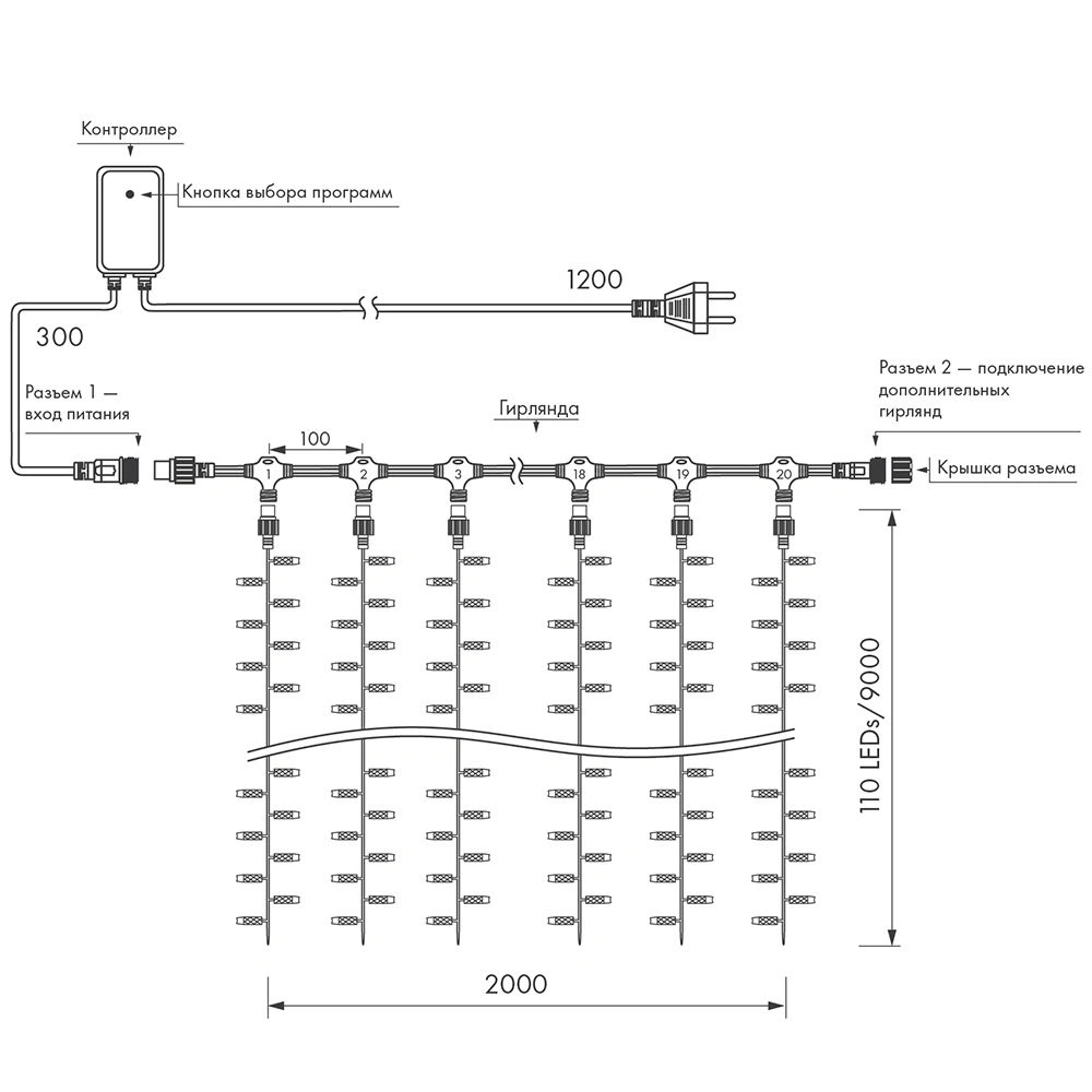Универсальная светодиодная гирлянда "ЗАНАВЕС" серии Classic отлично подходит для украшения и создания праздничной атмосферы как внутри помещений, так и снаружи (степень пылевлагозащиты IP65 позволяет размещать гирлянду на улице под навесом). Имея размеры 2000 x 9000 мм, она может использоваться для оформления небольших и средних площадей. Универсальные соединительные разъемы позволяют соединять до 3 гирлянд без использования дополнительных аксессуаров. Прозрачная вогнутая линза , 8 динамических эффектов и эффект непрерывного свечения обеспечивают яркое, равномерное освещение, выделяя украшаемые объекты. Холодный белый свет помогает создать необходимую атмосферу для декоративного объекта. Провод прозрачный изготовлен из ПВХ. Аксессуар для подключения и выбора режима свечения в комплекте.