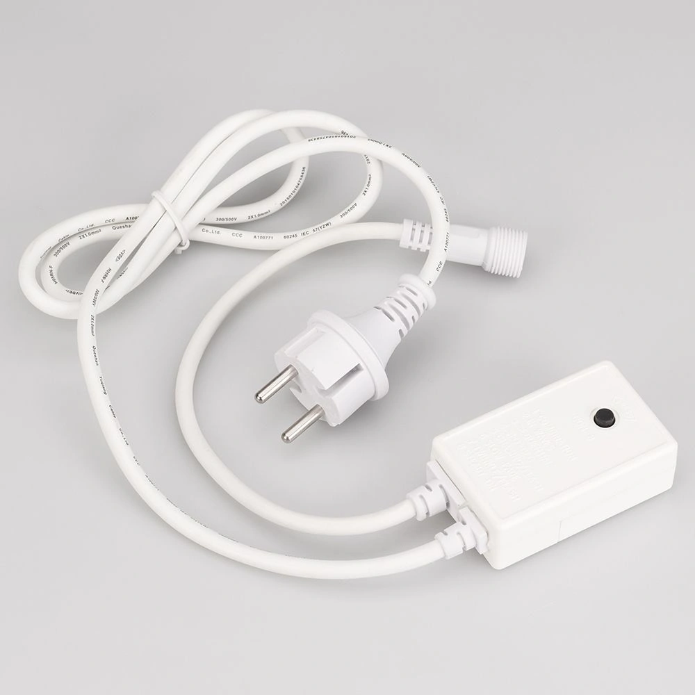 Контроллер предназначен для управления светодиодными гирляндами с эффектом динамики. В комплект входит шнур питания с вилкой европейского стандарта (IP44), 3pin разъем для подключения к гирлянде, выпрямитель AC/DC (1.6А), а также контроллер для смены режимов динамического свечения. Контроллер имеет 8 режимов, которые переключаются по кнопке на корпусе. Оболочка из белого каучука придает ему элегантный внешний вид. Длина провода составляет 1,5 метра, что позволяет удобно располагать гирлянду.