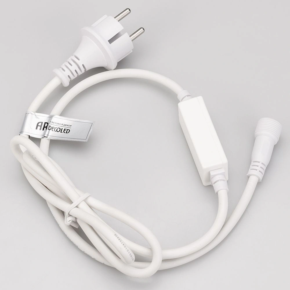 Шнур питания специально разработан для подключения светодиодных гирлянд с эффектом постоянного свечения к сети. В комплект входит шнур питания с вилкой европейского стандарта (IP44), 2pin разъем для подключения к гирлянде, а также выпрямитель AC/DC (1.6А). Оболочка из белого ПВХ придает ему элегантный внешний вид. Длина провода составляет 1,5 метра, что позволяет удобно располагать гирлянду.