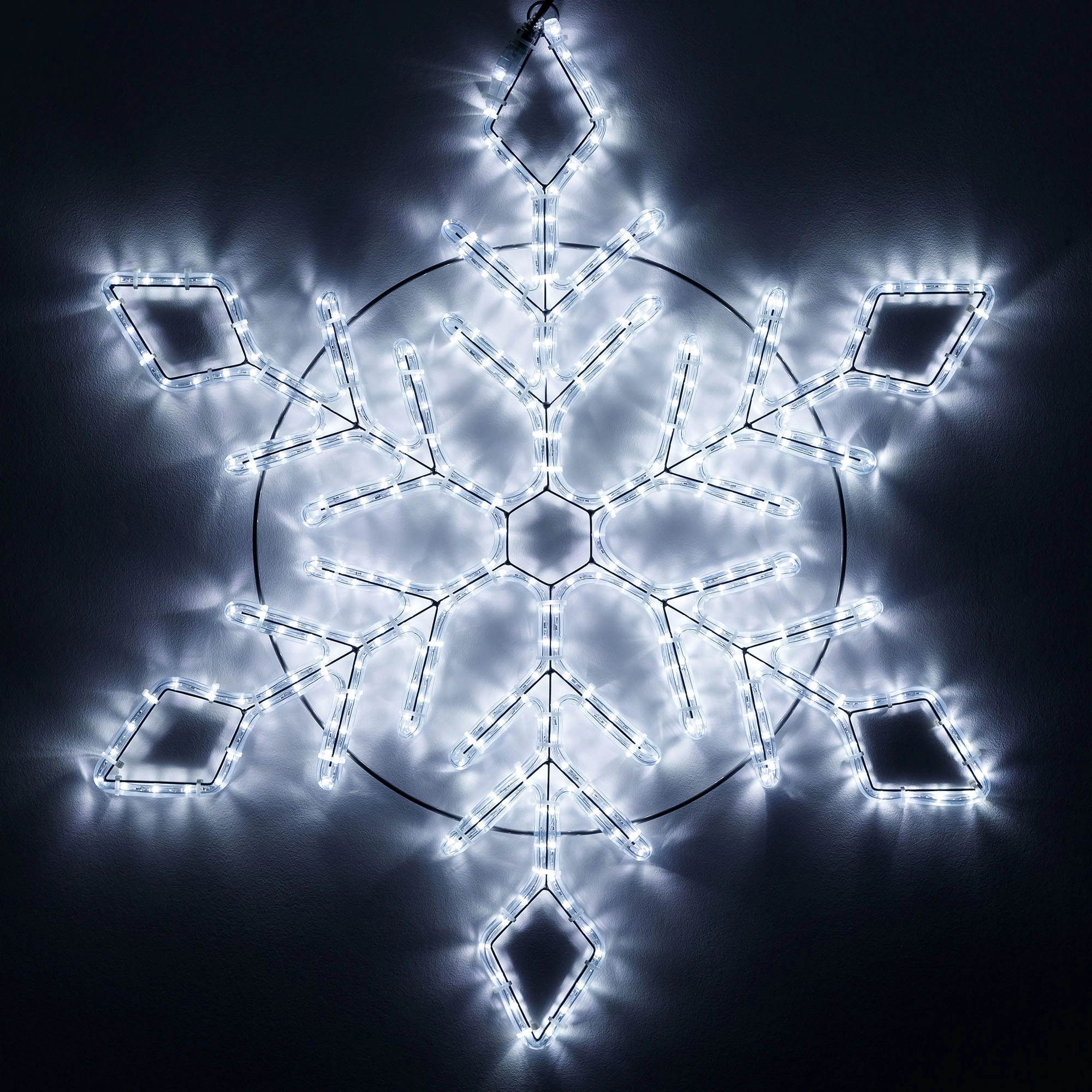 Светодиодная фигура СНЕЖИНКА. Размер 900x900 мм. Цвет светодиодов БЕЛЫЙ (6000 К), постоянное свечение. 360 светодиодов. Напряжение питания 230 В, потребляемая мощность 22 Вт, степень пылевлагозащиты IP65. Фигура укомплектована проводом питания для подключения к сети 230 В (без вилки питания).