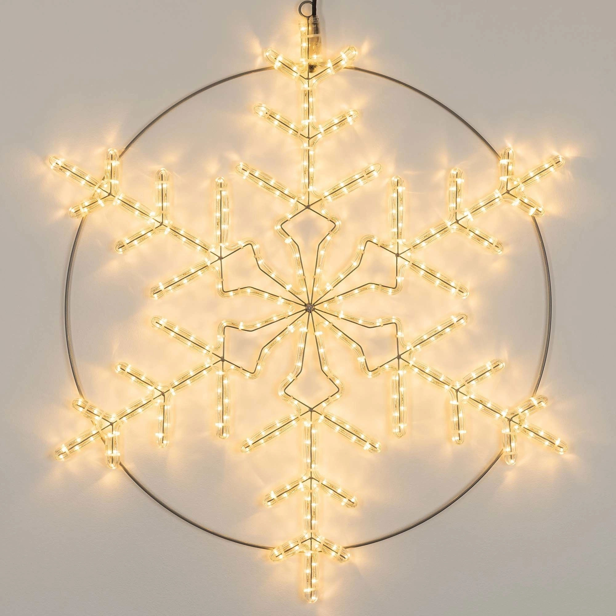 Светодиодная фигура СНЕЖИНКА. Размер 920x920 мм. Цвет светодиодов ТЕПЛЫЙ БЕЛЫЙ (3000 К), постоянное свечение. 432 светодиода. Напряжение питания 230 В, потребляемая мощность 30 Вт, степень пылевлагозащиты IP65. Фигура укомплектована проводом питания для подключения к сети 230 В (без вилки питания).