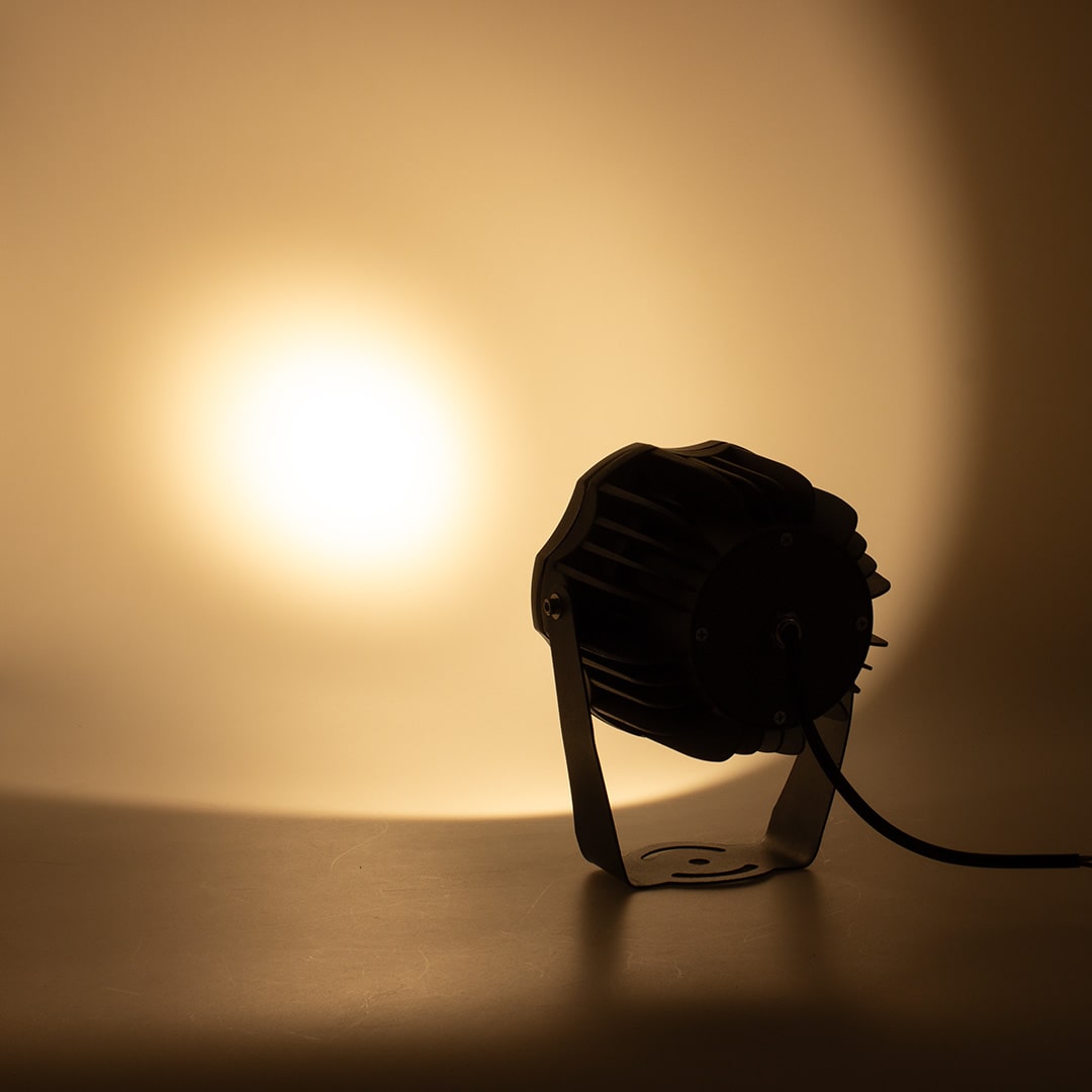 Светодиодный прожектор. Круглый серый корпус. Напряжение 85-265V, мощность 20W, цвет свечения теплый белый 3000-3500K, световой поток 2000Lm, угол свечения 36 градусов, степень защиты IP65. Коэффициент CRI>98. Диаметр 150мм, высота 180мм. Размеры упаковки 190х130х220мм. Вес 1700г.