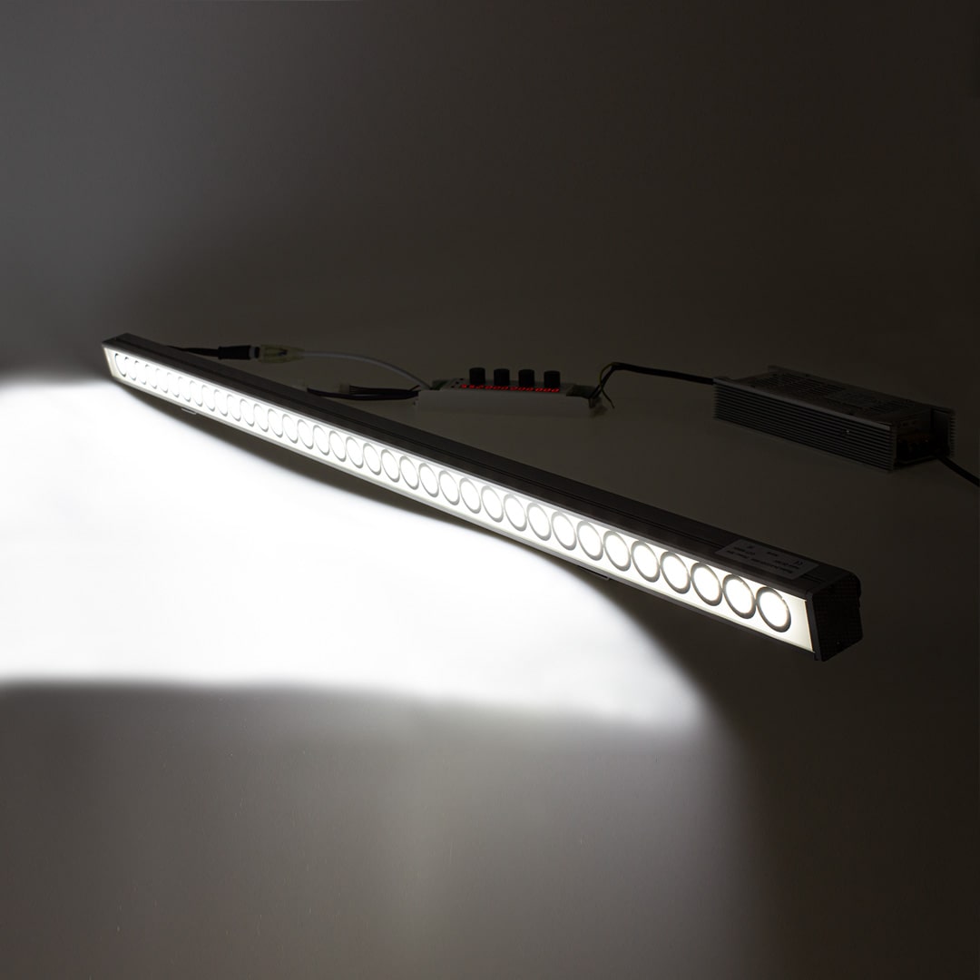 Линейный светодиодный прожектор. Напряжение DC24V, мощность 36W, цвет свечения белый 6500K, угол свечения 15 градусов. Размеры 995x30x40мм. Вес 1300г.