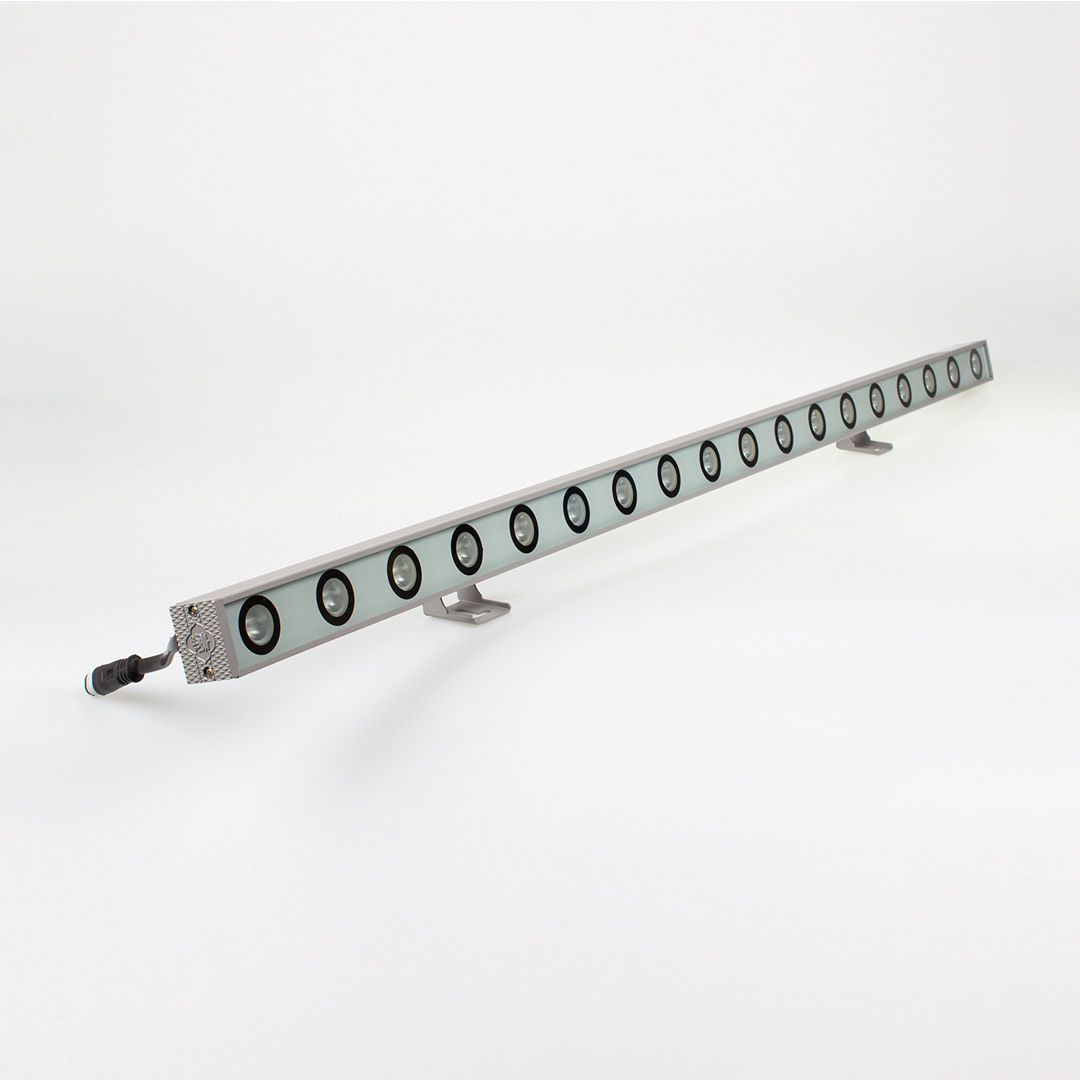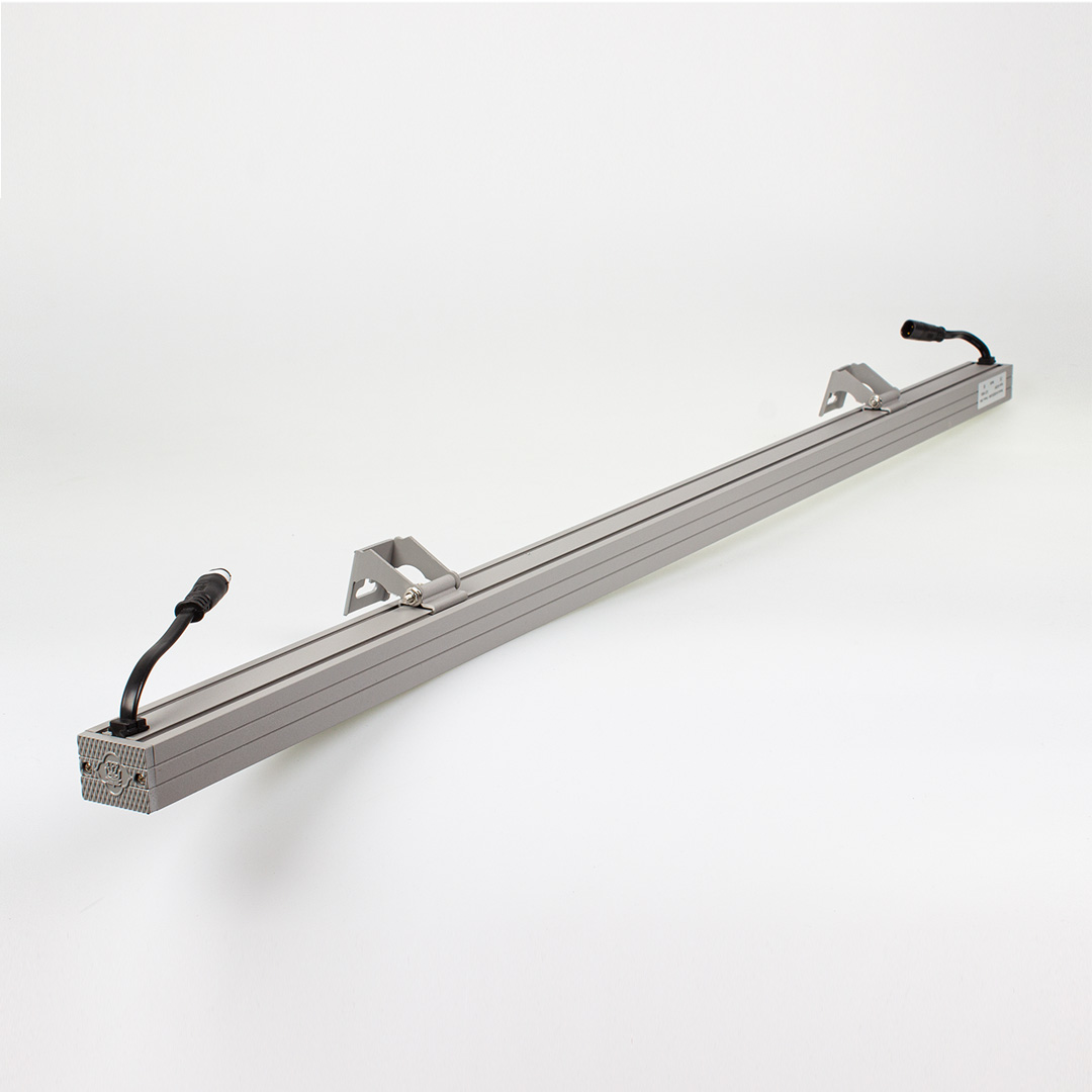 Линейный светодиодный прожектор. Напряжение AC24V, мощность 24W, цвет свечения RGB, неуправляемый (встроенная программа смены цвета). Синхронизация осуществляется с помощью переменного напряжения, от блока питания. Угол свечения 15 градусов. Размеры 995x28x36мм. Вес 1000г.