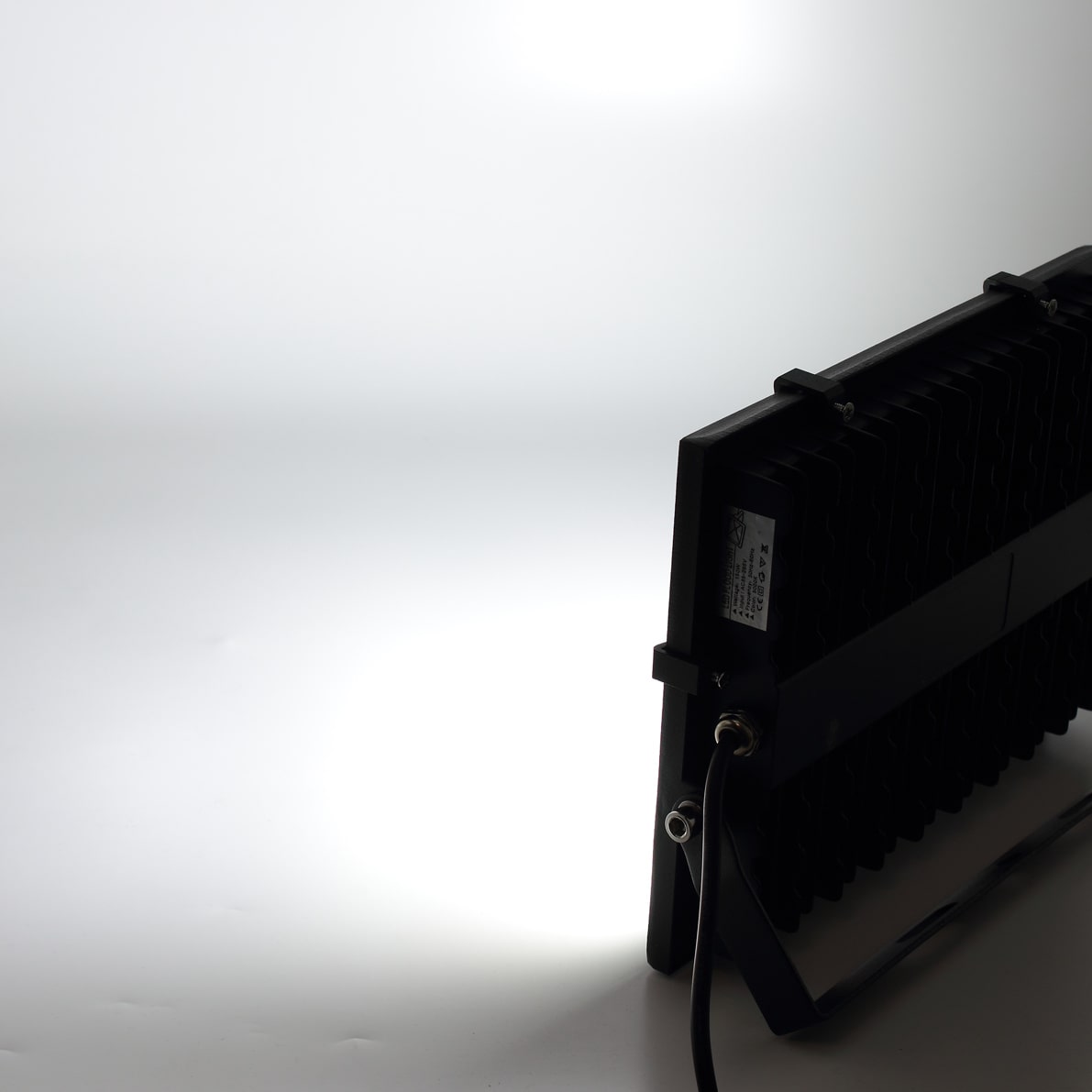 Светодиодный прожектор. Напряжение 85-265V, мощность 150W, цвет свечения белый 5500-6500К, световой поток 90Lm/w, угол свечения 120 градусов, степень защиты IP66. Размеры 300x220x42мм. Вес 1600г. Гарантия 2 года.