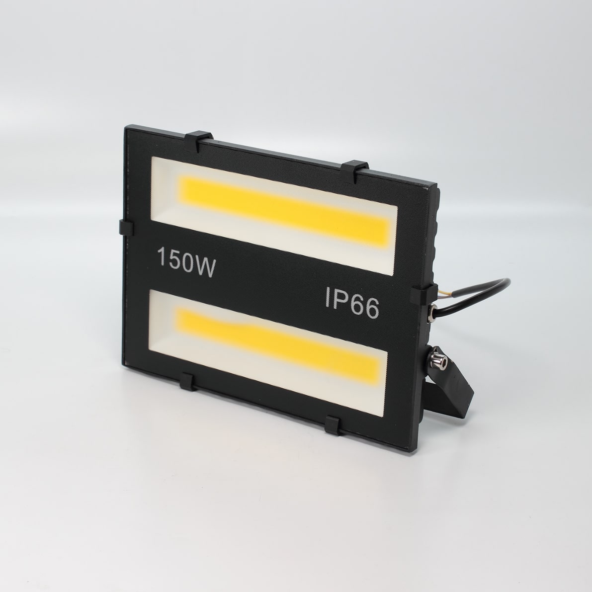 Светодиодный прожектор. Напряжение 85-265V, мощность 150W, цвет свечения теплый белый 3000-3500К, световой поток 90Lm/w, угол свечения 120 градусов, степень защиты IP66. Размеры 300x220x42мм. Вес 1600г. Гарантия 2 года.
