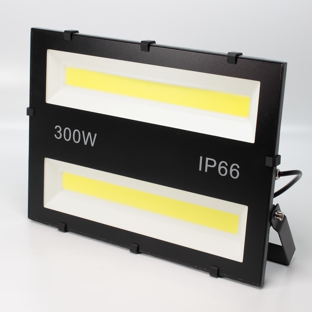 Светодиодный прожектор. Напряжение 85-265V, мощность 300W, цвет свечения белый 5500-6500К, световой поток 90Lm/w, угол свечения 120 градусов, степень защиты IP66. Размеры 415x315x47мм. Вес 3250г. Гарантия 2 года.