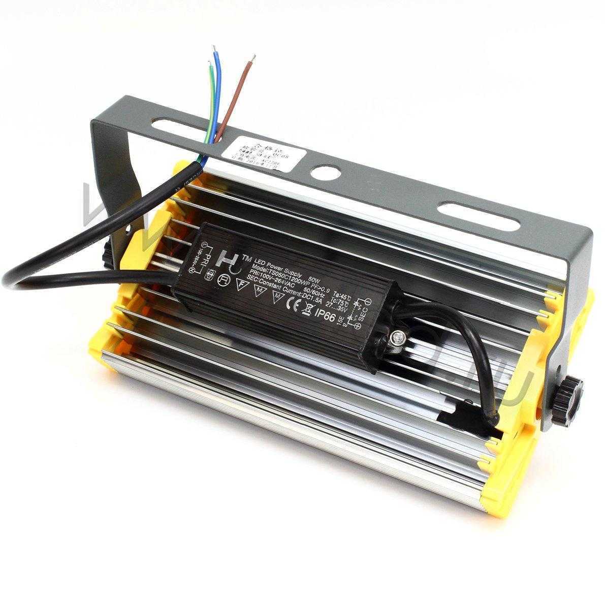 Светодиодный прожектор с возможностью монтажа на потолок или стену. Напряжение 100-264V, мощность 50W, цвет свечения белый 6000К, световой поток 5000Lm, угол свечения 45х150 градусов, степень защиты IP65. Драйвер 27-35В, 1,5А. Размеры 235x135x75мм. Вес 1000г.