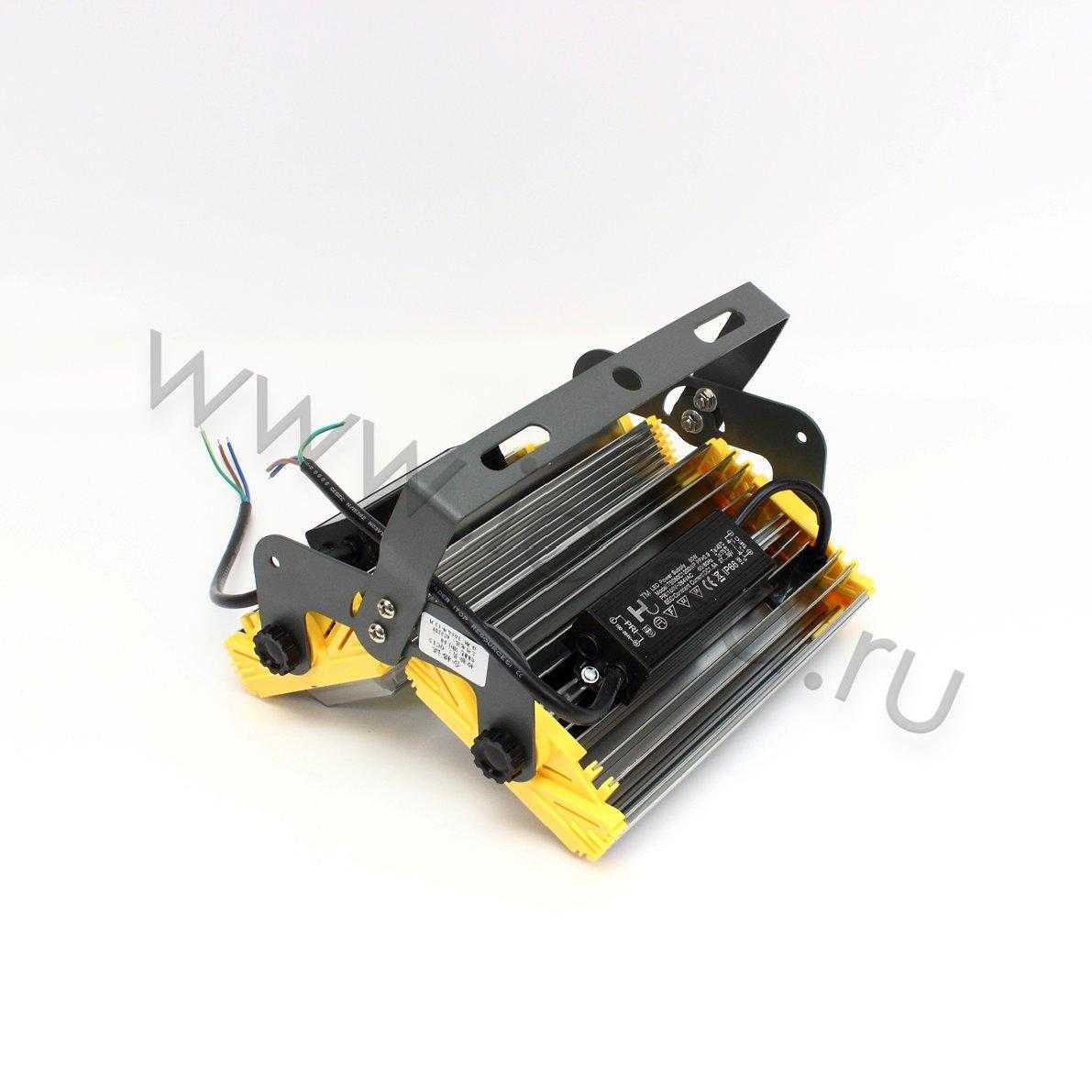 Светодиодный прожектор с возможностью монтажа на потолок или стену. Напряжение 100-264V, мощность 100W, цвет свечения белый 6000К, световой поток 10000Lm, угол свечения 45х150 градусов, степень защиты IP65. Драйвер 2шт: 27-35В, 1,5А. Размеры 235x225x90мм. Вес 2100г.