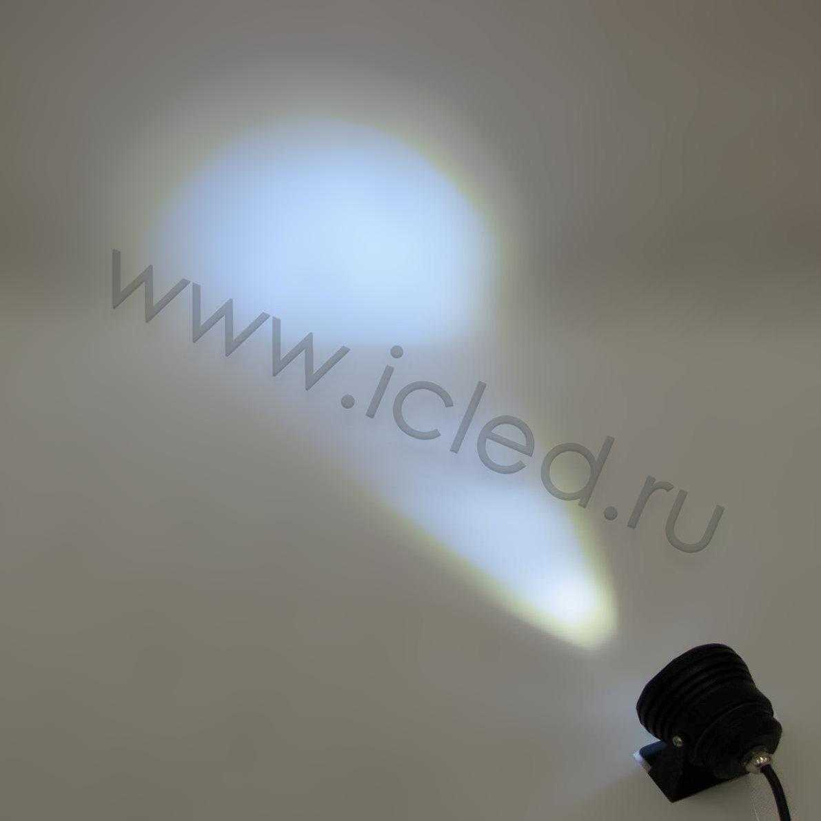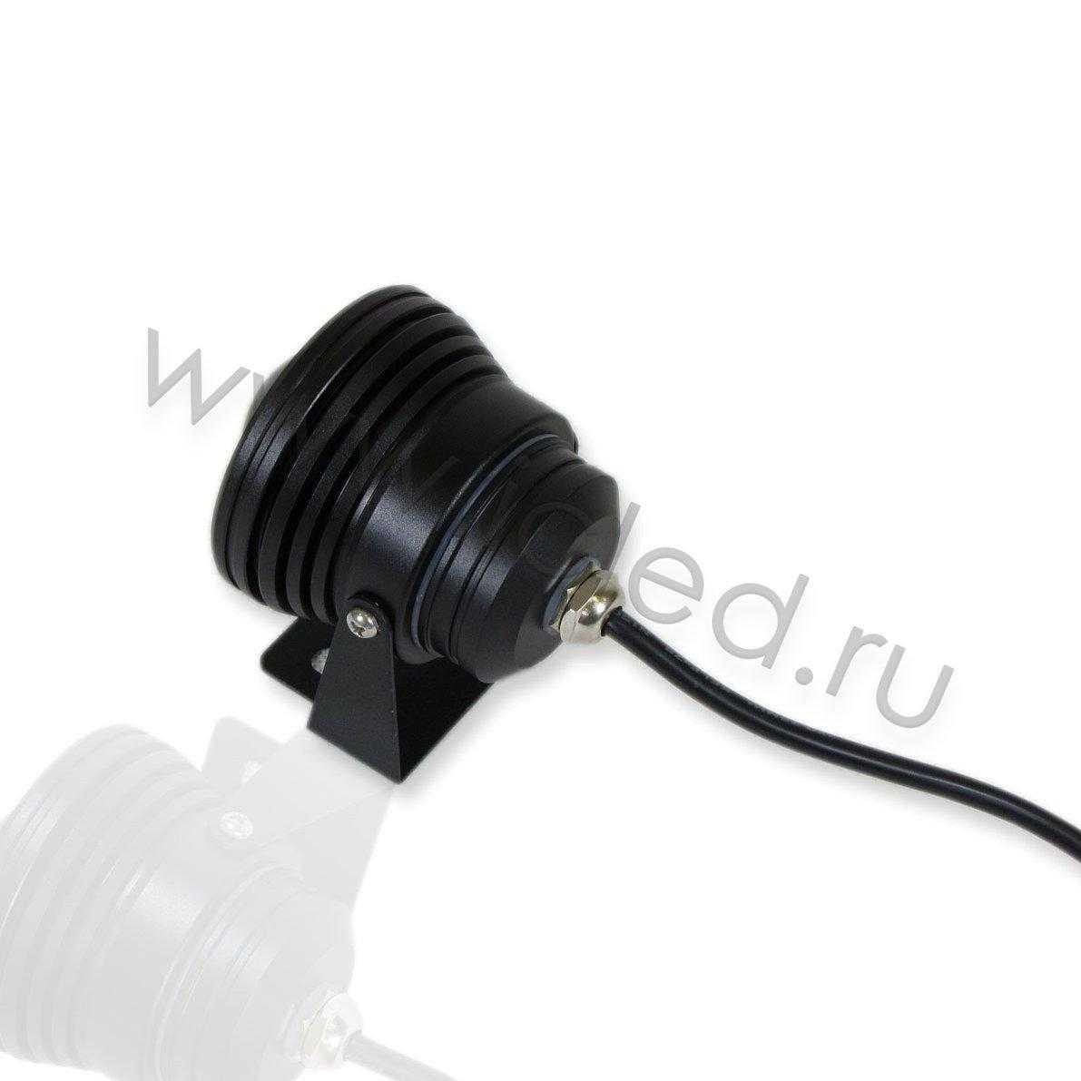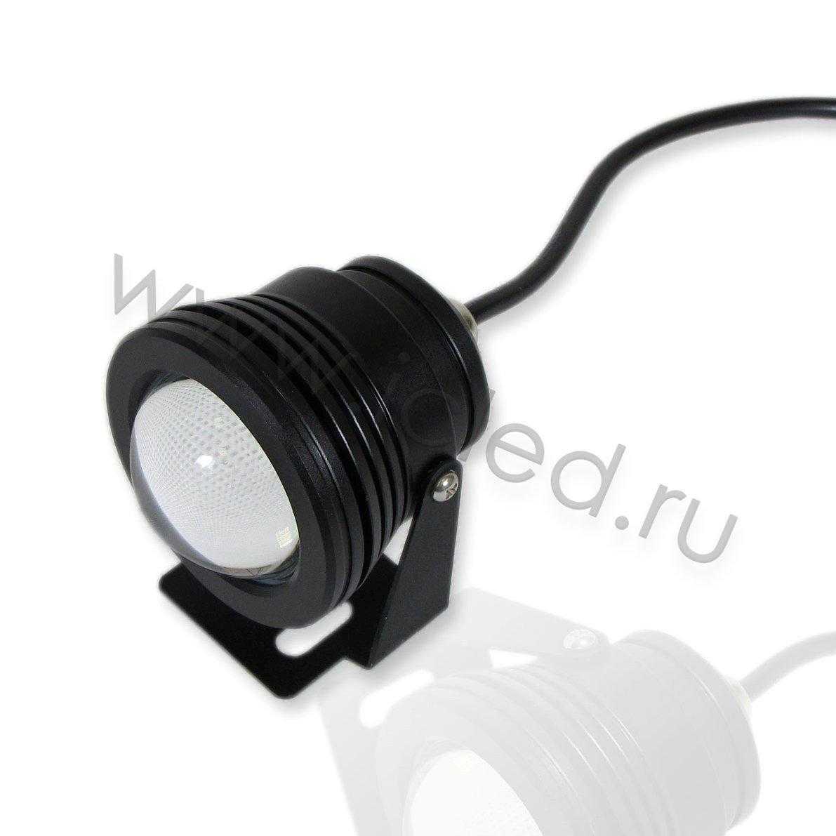 Светодиодный прожектор. Круглый черный корпус. Напряжение 12V, мощность 10W, цвет свечения белый 6000-6500K, световой поток 800-900Lm, угол свечения 30 градусов, степень защиты IP65. Коэффициент CRI>80. Диаметр 73мм, длина 95мм.