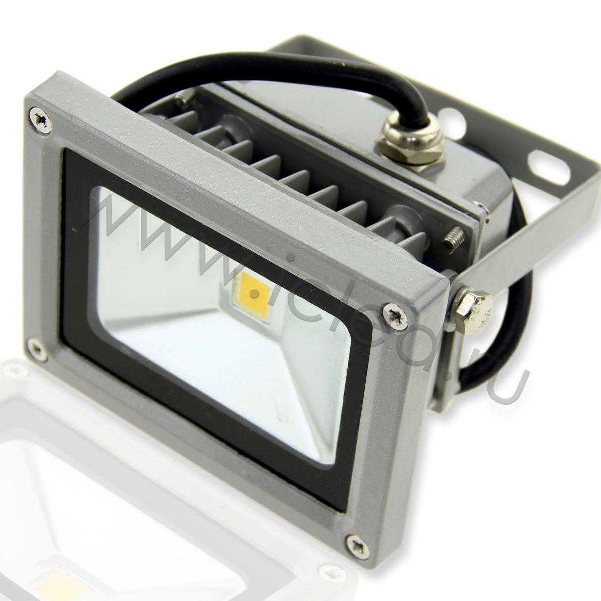 Светодиодный прожектор. Стандартный корпус. Напряжение 220V, мощность 10W, цвет свечения теплый белый 3000-3300K, световой поток 800-900Lm, угол свечения 120x60 градусов, степень защиты IP65. Размеры 114x86x80мм.