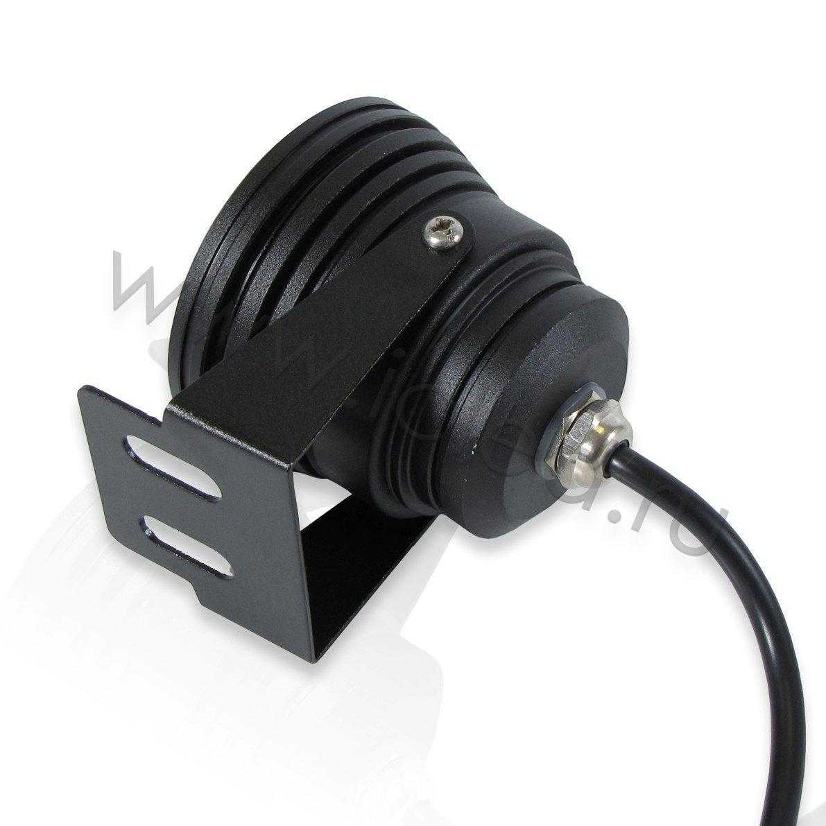 Светодиодный прожектор RGB. Пульт ИК в комплекте. Круглый черный корпус. Напряжение 12V, мощность 10W, цвет свечения RGB, угол свечения 30 градусов, степень защиты IP65. Диаметр 73мм, длина 95мм.