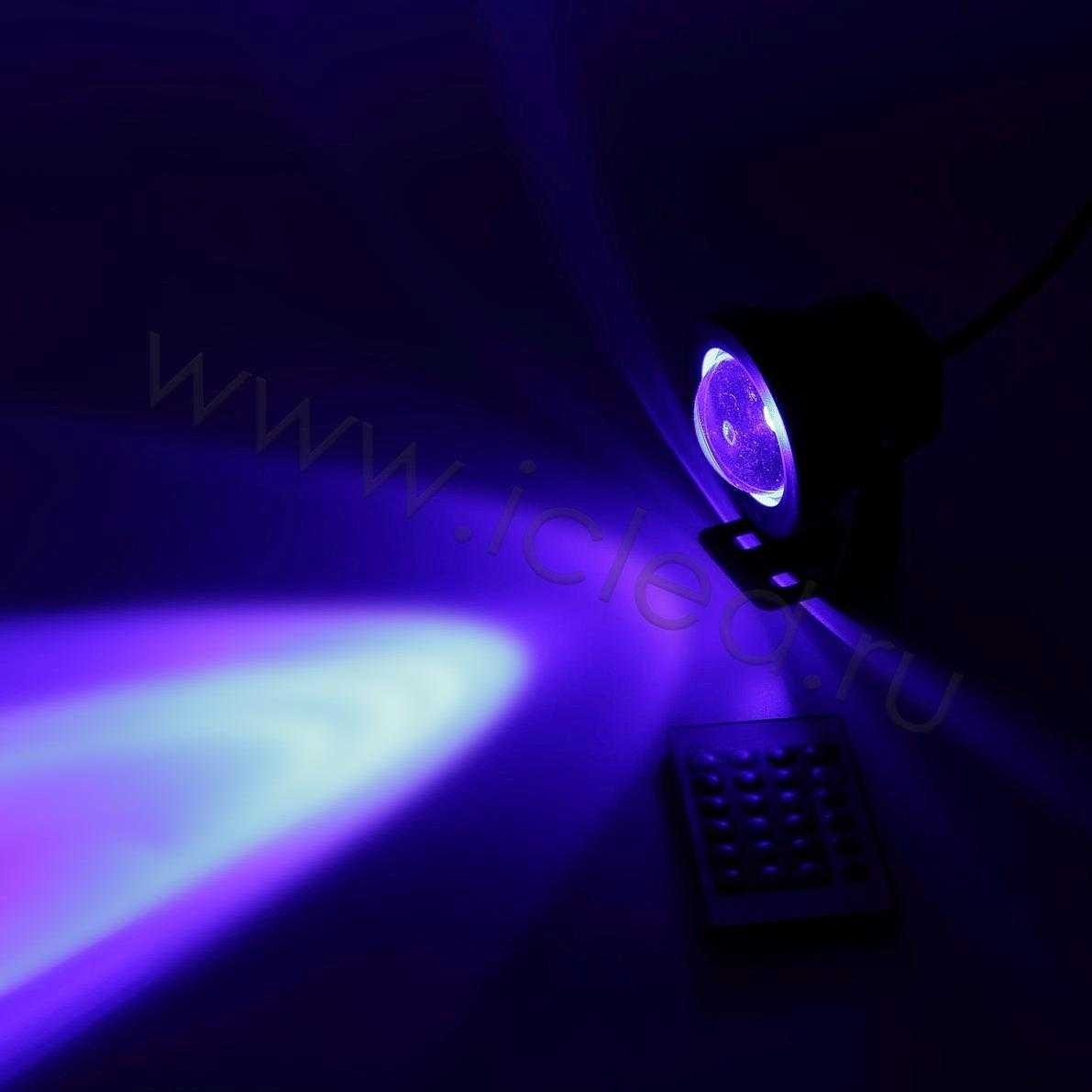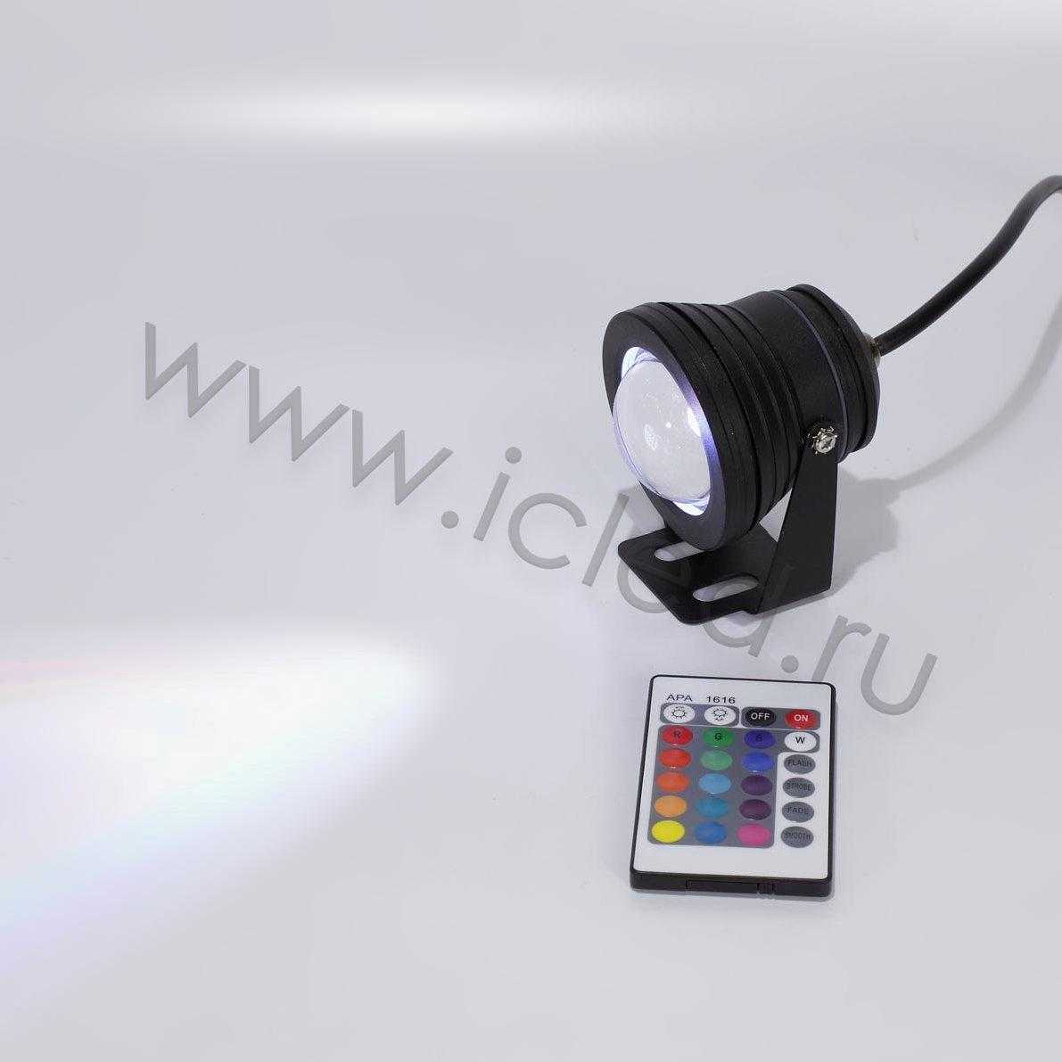 Светодиодный прожектор RGB. Пульт ИК в комплекте. Круглый черный корпус. Напряжение 85-265V, мощность 10W, цвет свечения RGB, угол свечения 30 градусов, степень защиты IP65. Размеры 70x80x100мм.