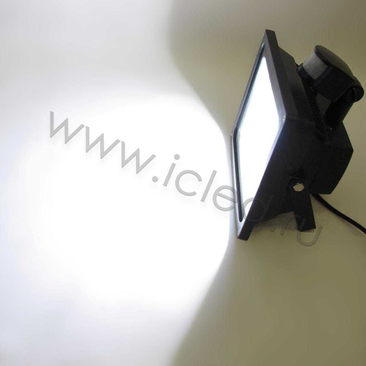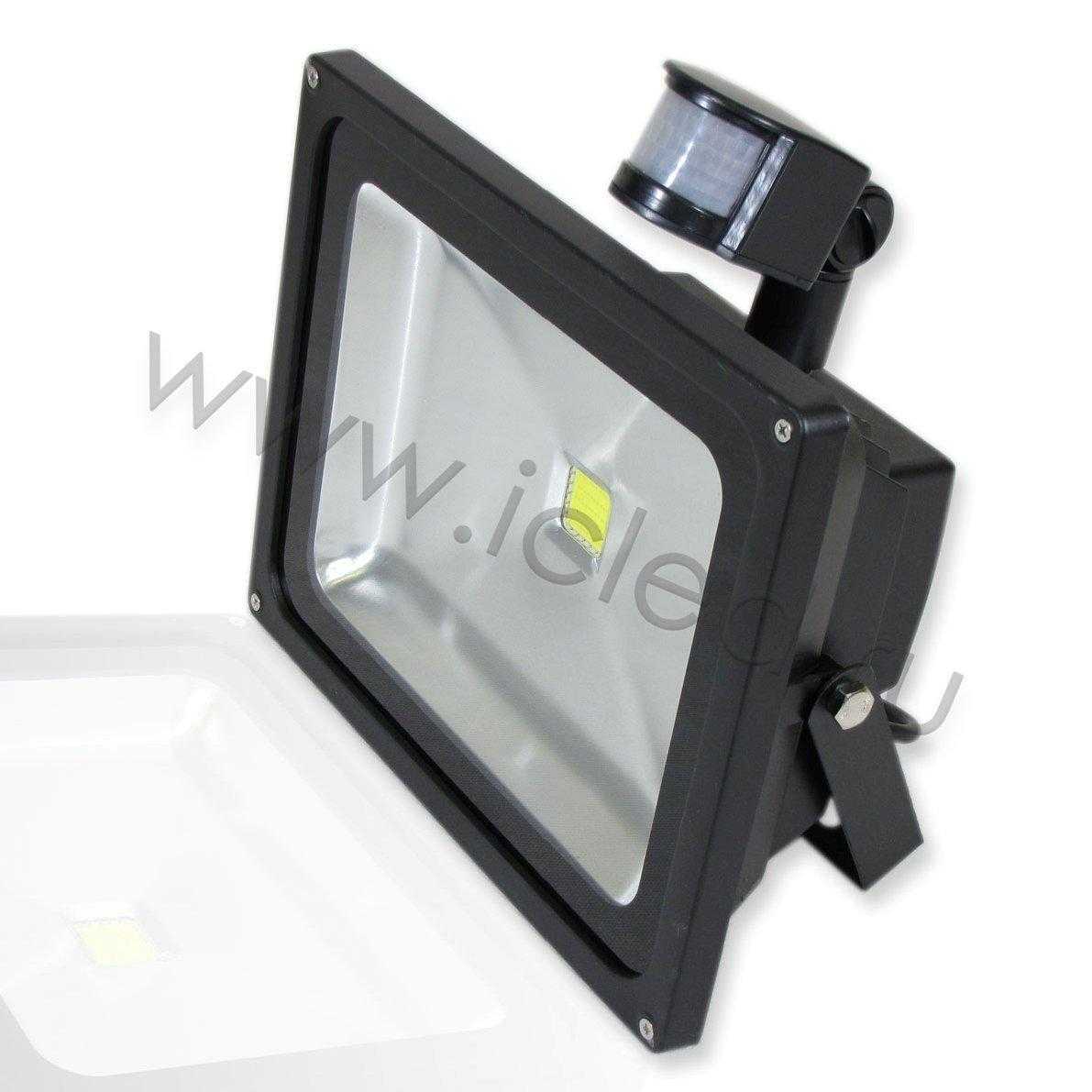 Светодиодный прожектор с датчиком движения. Стандартный корпус. Напряжение 220V, мощность 50W, цвет свечения белый 6000-6500K, световой поток 3500-4000Lm, угол свечения 120x60 градусов, степень защиты IP65. Размеры 267x234x145мм.