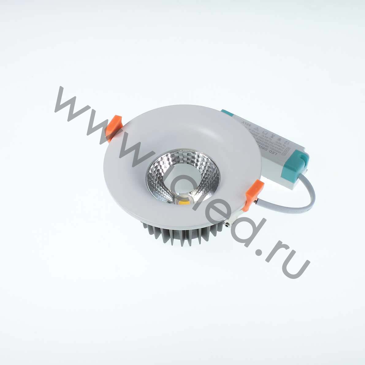 Потолочный светодиодный светильник. Круглый белый корпус с прозрачным рассеивателем. Диаметр 123мм (под отверстие 110мм), высота 70мм. Напряжение 85-265V, мощность 15W, цвет свечения теплый белый 3000-3500K, световой поток 1200Lm, угол свечения 60 градусов. Драйвер 30-70V 300mA. Вес 380гр
