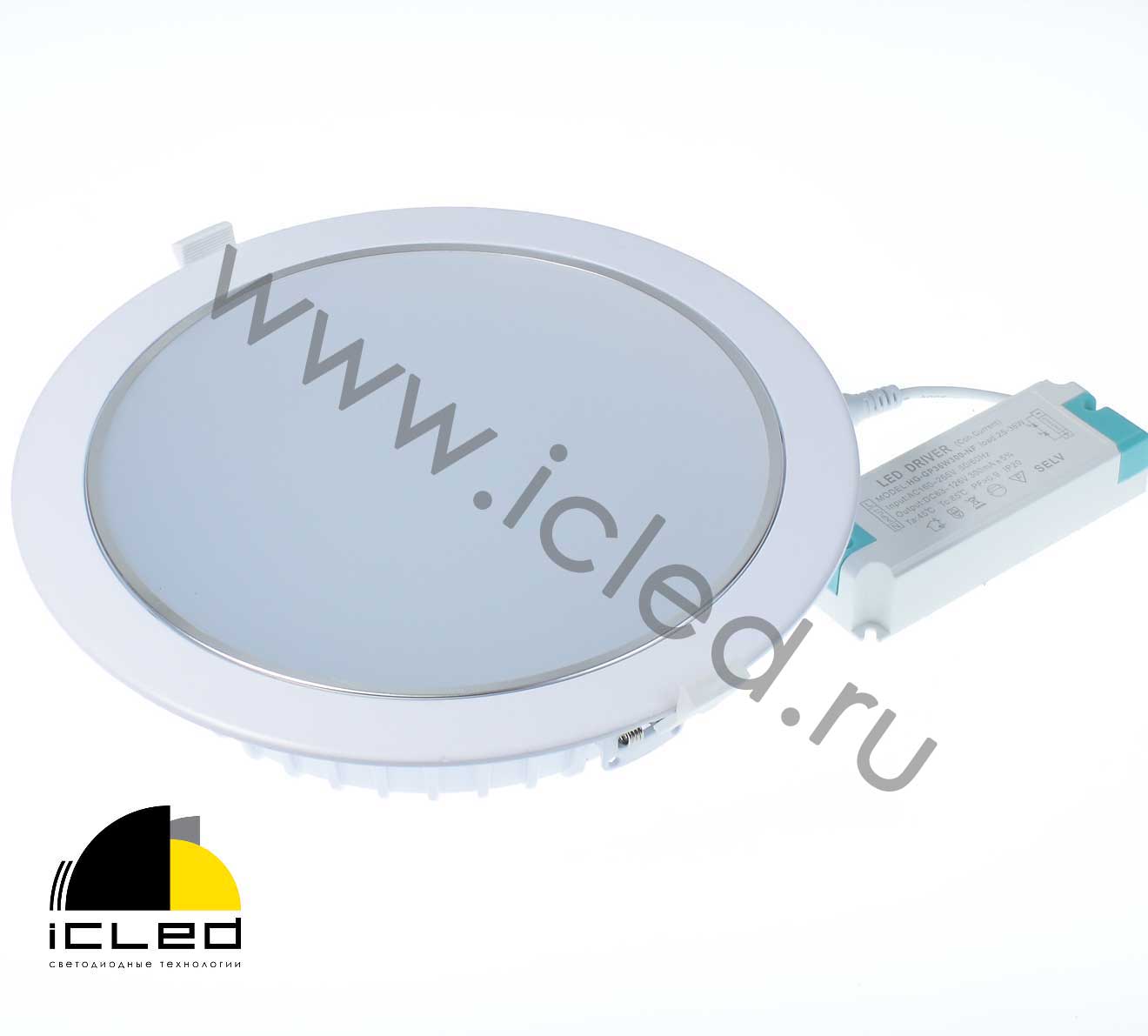 Потолочный светодиодный светильник. Круглый белый корпус с матовым рассеивателем. Диаметр 230мм (под отверстие 210мм), высота 60мм. Напряжение 85-265V, мощность 30W, цвет свечения дневной белый 4000-4500K, световой поток 2400Lm, угол свечения 120 градусов. Драйвер 63-126V 300mA. Вес 900гр