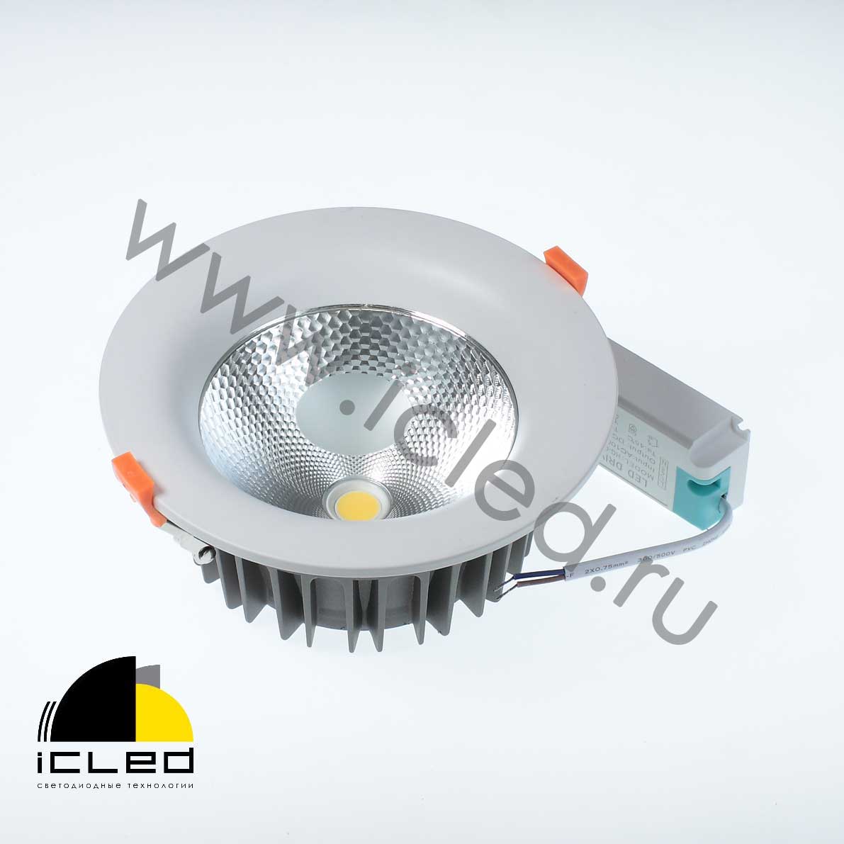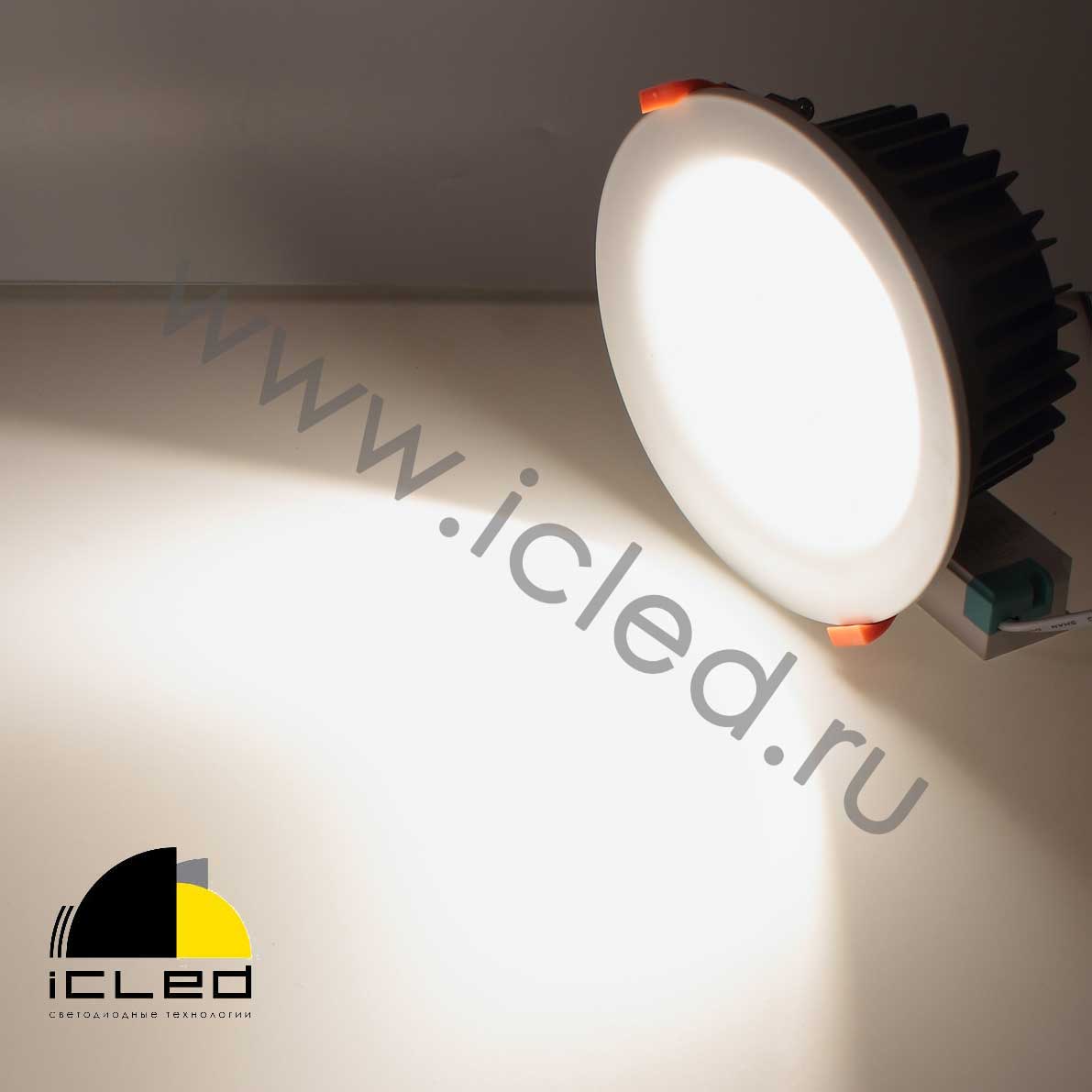 Потолочный светодиодный светильник. Круглый белый корпус с прозрачным рассеивателем. Диаметр 175мм (под отверстие 150мм), высота 90мм. Напряжение 85-265V, мощность 30W, цвет свечения белый 4000-4500K, световой поток 2400Lm, угол свечения 90 градусов. Драйвер 22-42V 750mA. Вес 730гр