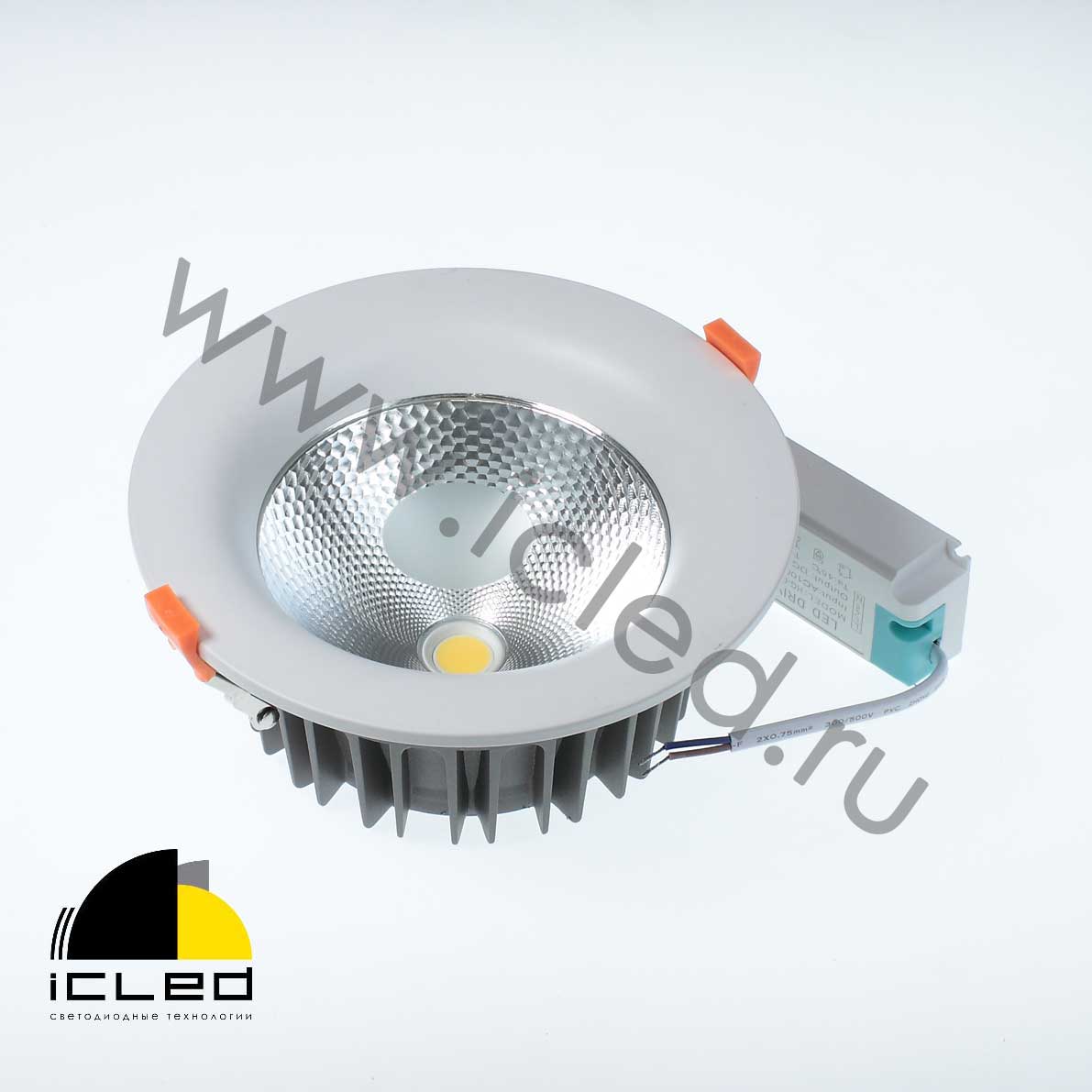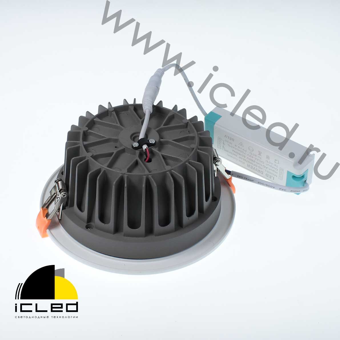 Потолочный светодиодный светильник. Круглый белый корпус с прозрачным рассеивателем. Диаметр 175мм (под отверстие 150мм), высота 90мм. Напряжение 85-265V, мощность 30W, цвет свечения белый 3000-3500K, световой поток 2400Lm, угол свечения 90 градусов. Драйвер 22-42V 750mA. Вес 730гр