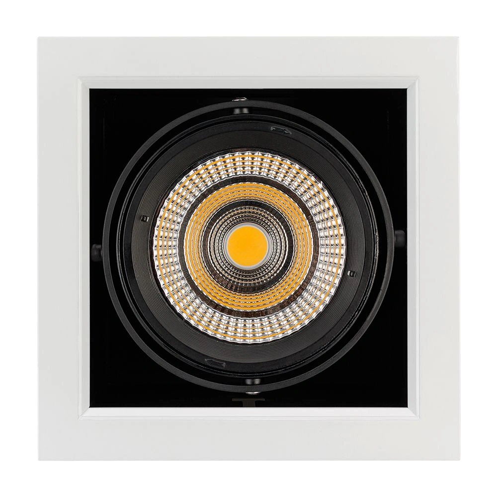 Встраиваемый карданный поворотный светильник с высоким индексом цветопередачи CRI>80 предназначен для создания качественного направленного освещения. За основу поворотного механизма светильника взят принцип кардана – подвижное соединение двух колец, вложенных одно в другое. Световой модуль отклоняется на 45 градусов, что позволяет с лёгкостью регулировать направление пучка света и его концентрацию на определенной зоне. Особая конфигурация корпуса из алюминия оригинально смотрится в интерьере и позволяет эффективно отводить тепло. Светильник с узким углом рассеивания 30 градусов и световым потоком 2200 лм отлично подходит для локальной акцентной подсветки витрин, прилавков магазинов, бутиков и стендов выставочных залов. Легко устанавливается с помощью пружин в монтажное отверстие потолка. В комплекте поставляется драйвер, что позволяет безопасно и быстро подключать светильник напрямую к сети переменного тока 230 В. Диммирование возможно при замене штатного драйвера.