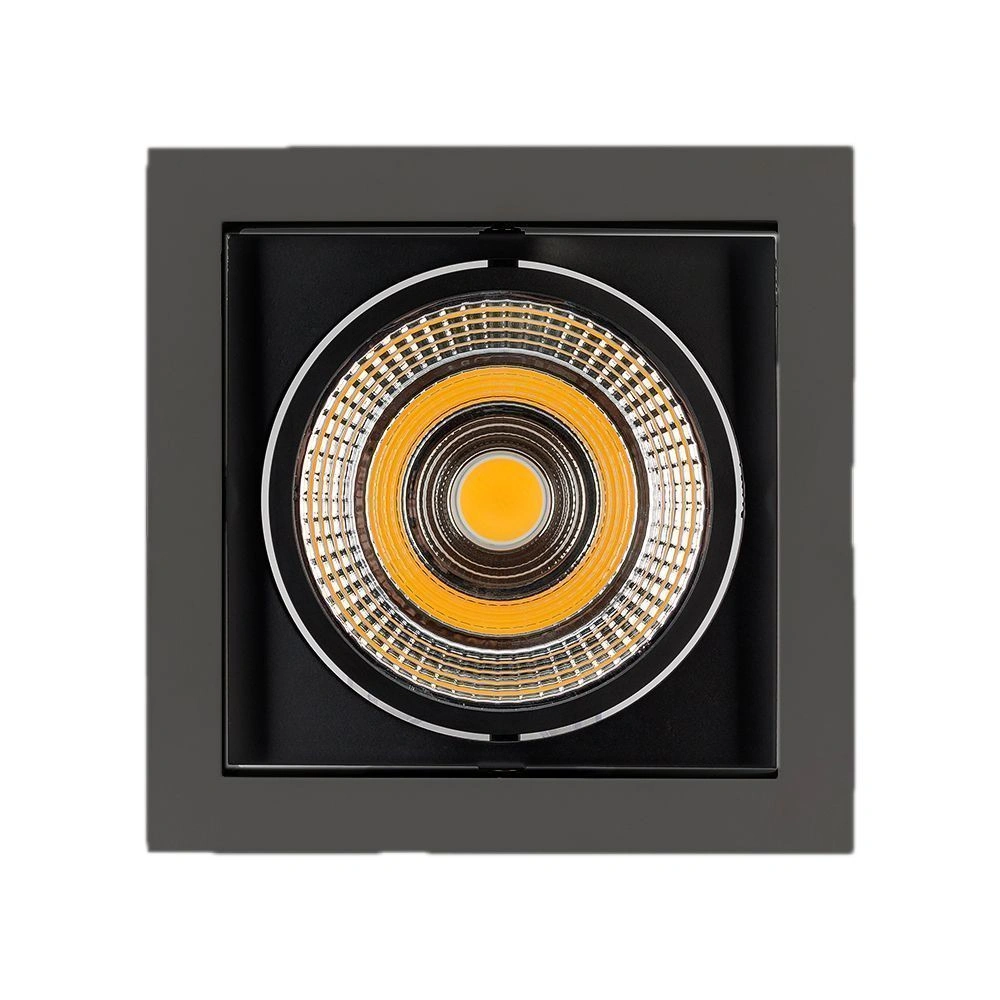 Встраиваемый карданный поворотный светильник с высоким индексом цветопередачи CRI>80 предназначен для создания качественного направленного освещения. За основу поворотного механизма светильника взят принцип кардана – подвижное соединение двух колец, вложенных одно в другое. Световой модуль отклоняется на 45 градусов, что позволяет с лёгкостью регулировать направление пучка света и его концентрацию на определенной зоне. Особая конфигурация корпуса из алюминия оригинально смотрится в интерьере и позволяет эффективно отводить тепло. Светильник с узким углом рассеивания 30 градусов и световым потоком 2200 лм отлично подходит для локальной акцентной подсветки витрин, прилавков магазинов, бутиков и стендов выставочных залов. Легко устанавливается с помощью пружин в монтажное отверстие потолка. В комплекте поставляется драйвер, что позволяет безопасно и быстро подключать светильник напрямую к сети переменного тока 230 В. Диммирование возможно при замене штатного драйвера.