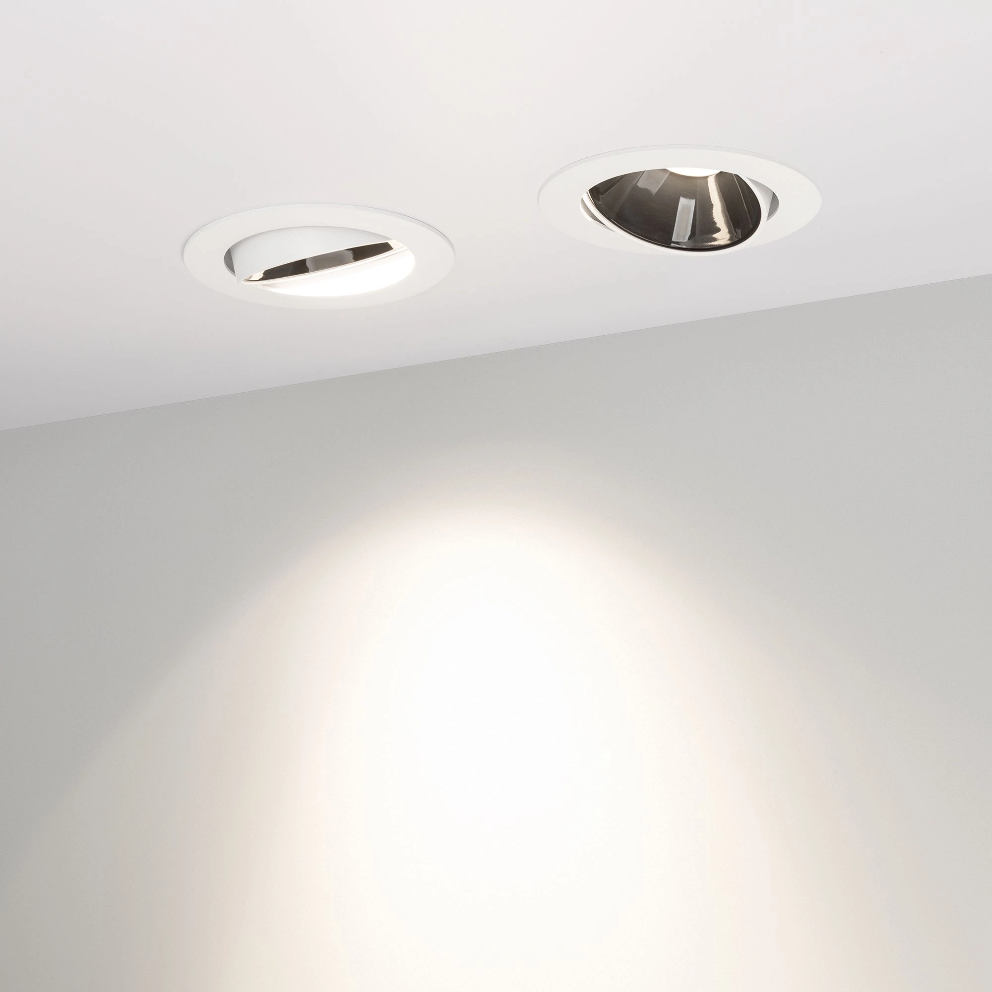 Встраиваемый поворотный светильник FORECAST обладает низким коэффициентом дискомфорта UGR<16, благодаря чему достигается комфортный индекс освещенности. Светильник с цветопередачей CRI>90 обеспечивает достоверную передачу цветов и оттенков. Световой поток 910 лм и узкий угол излучения 32 градуса , защита корпуса на уровне IP20 предназначены для направленного освещения торговых, офисных, жилых и других помещений, в которых отсутствует контакт с водой. Световой модуль может поворачиваться вокруг вертикальной оси на 355 и отклоняться от горизонтали на 30 градусов, позволяя мгновенно менять направление света и расставлять световые акценты. Светильник легко устанавливается с помощью пружин в монтажное отверстие потолка. Драйвер поставляется в комплекте для безопасного и быстрого подключения к сети переменного тока 230 В. Пульсация менее 2% обеспечивает равномерное освещение без мерцания. Диммирование возможно при замене штатного драйвера.