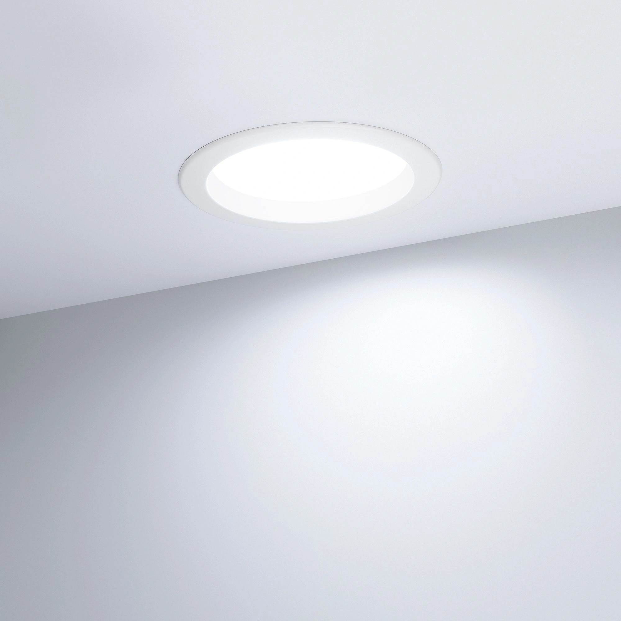 Встраиваемый круглый светильник предназначен для освещения в жилых, коммерческих и общественных помещениях. Индекс цветопередачи CRI>80 обеспечивает качественное освещение с точной передачей цветов. Алюминиевый корпус, окрашенный в белый цвет, будет гармонично смотреться в любом интерьере. Особая конфигурация корпуса позволяет эффективно отводить тепло и продлевает срок службы светодиодов. Матовый экран создает равномерное освещение без видимости точек светодиодов. Светильник с широким углом излучения 90 градусов подойдет для общего освещения помещений. Легко устанавливается в натяжные или гипсокартонные потолки с помощью пружин в монтажное отверстие. В комплекте поставляется драйвер, что позволяет безопасно и быстро подключать светильник напрямую к сети переменного тока 230 В. Корпус с защитой от пыли на уровне IP 40 применим для помещений, в которых отсутствует контакт с водой или другими жидкостями. Имеется возможность диммирования при замене штатного драйвера.