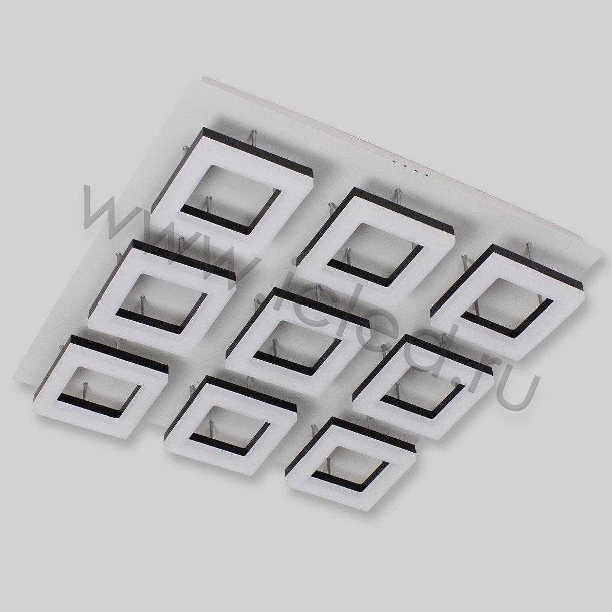 Светодиодная люстра. Прямоугольный белый корпус. Входное напряжение 85-265V, мощность 100W. Цвет свечения дневной белый 4000-4500К, световой поток 7500Lm, угол свечения 180 градусов. Размеры 670х670x130мм. Вес 6000гр.