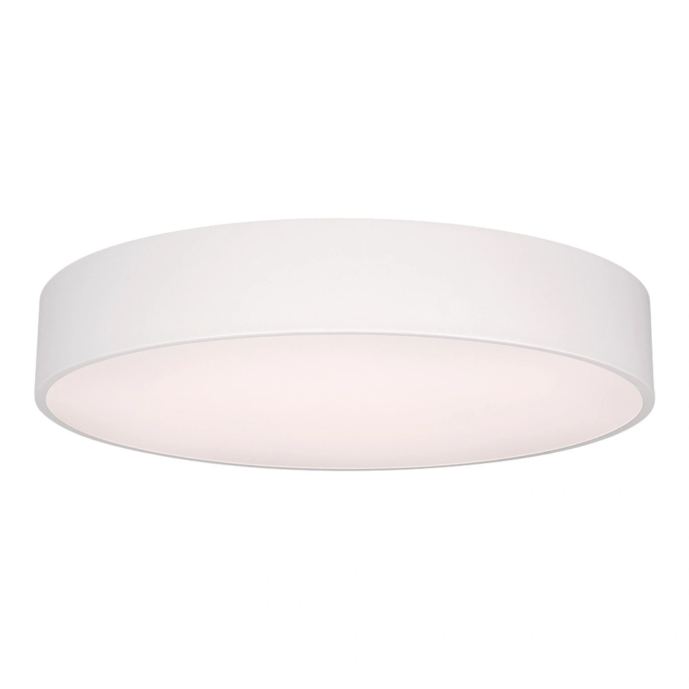 Накладной интерьерный светильник. Мощность 50 Вт, св. поток 4050 лм, 80 лм/Вт, дневной 4000 K, CRI>80, угол 100°, напряжение питания 230 В. Белый круглый корпус из алюминия, степень защиты IP20. Призматический акриловый рассеиватель. Размер: диаметр 600 мм, высота 100 мм. Монтаж накладной. Драйвер 28-42 В, 1200 мА, пульсация <2%.
