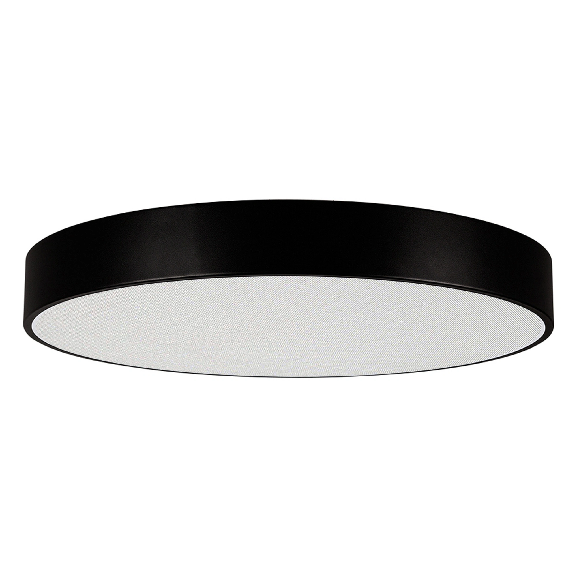 Накладной интерьерный светильник. Мощность 94 Вт, св. поток 7620 лм, 80 лм/Вт, дневной 4000 K, CRI>80, угол 100°, напряжение питания 230 В. Черный круглый корпус из алюминия, степень защиты IP20. Призматический акриловый рассеиватель. Размер: диаметр 800 мм, высота 100 мм. Монтаж накладной. Драйвер 28-42 В, 1200 мА (2 шт.), пульсация <2%.