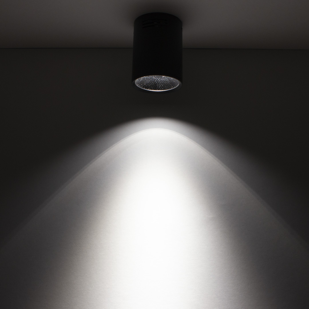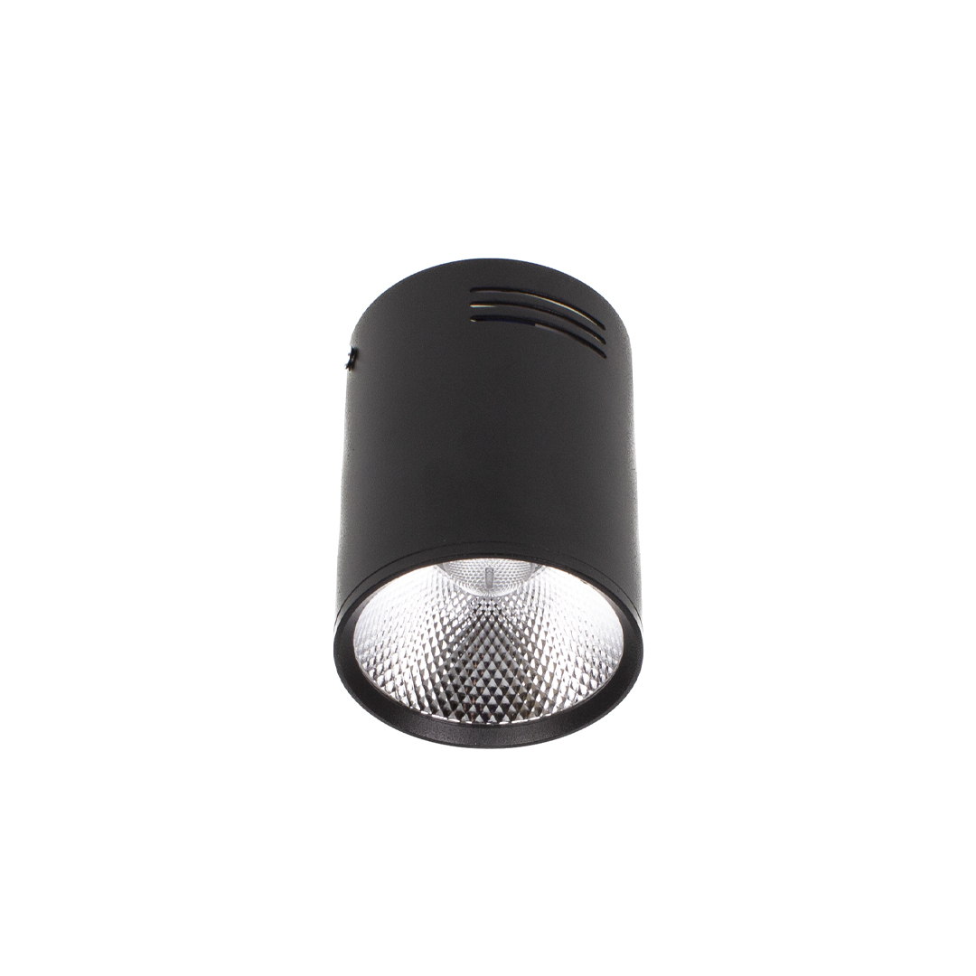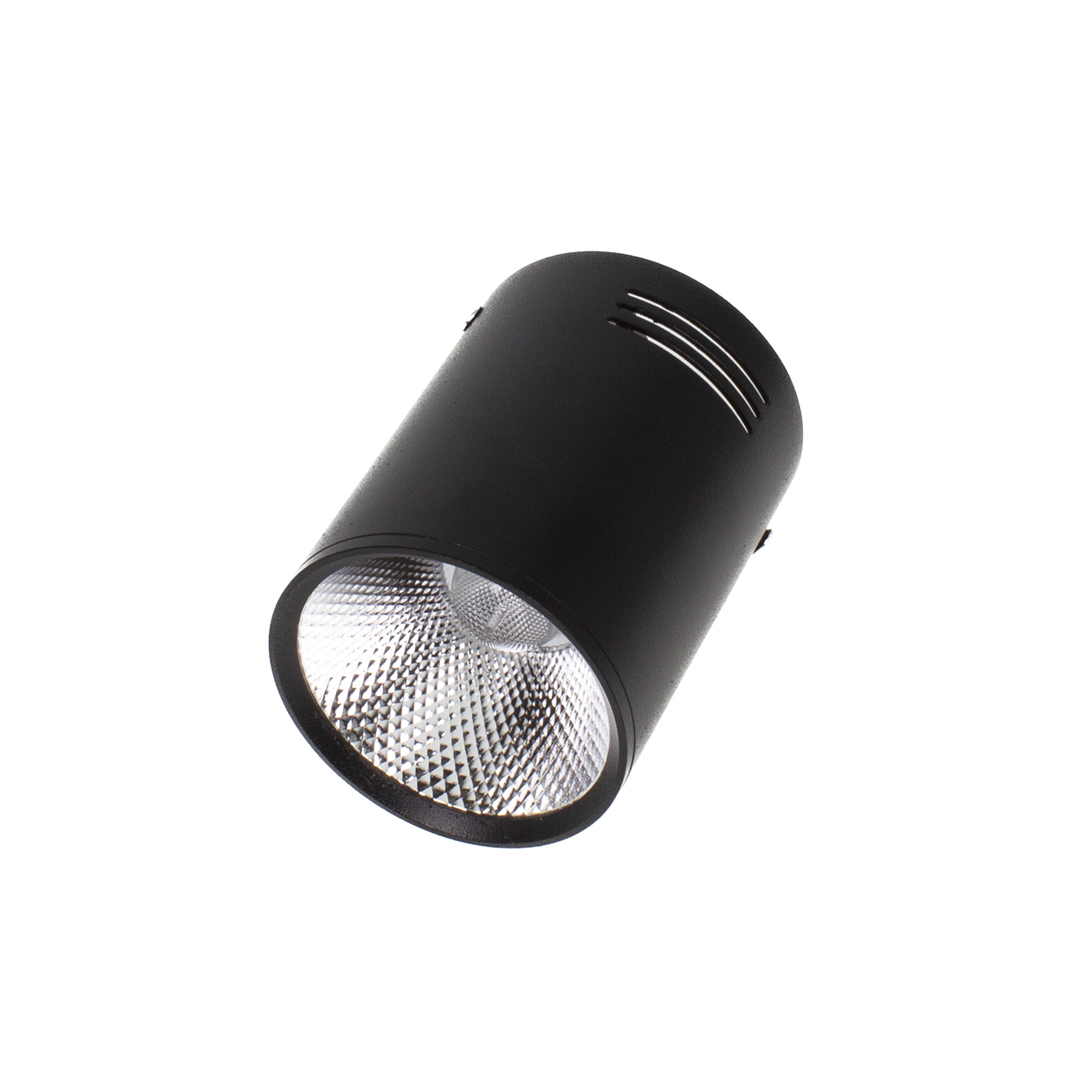 Светодиодный светильник накладной. Цилиндрический черный корпус. Напряжение 85-265V, мощность 7Вт, цвет свечения дневной белый 4000-4500K, световой поток 630Lm. Угол свечения 30 градусов. Драйвер 12-26V, 300mA. Диаметр 76мм, высота 100мм. Размеры упаковки 80х80х110мм. Вес 220г.