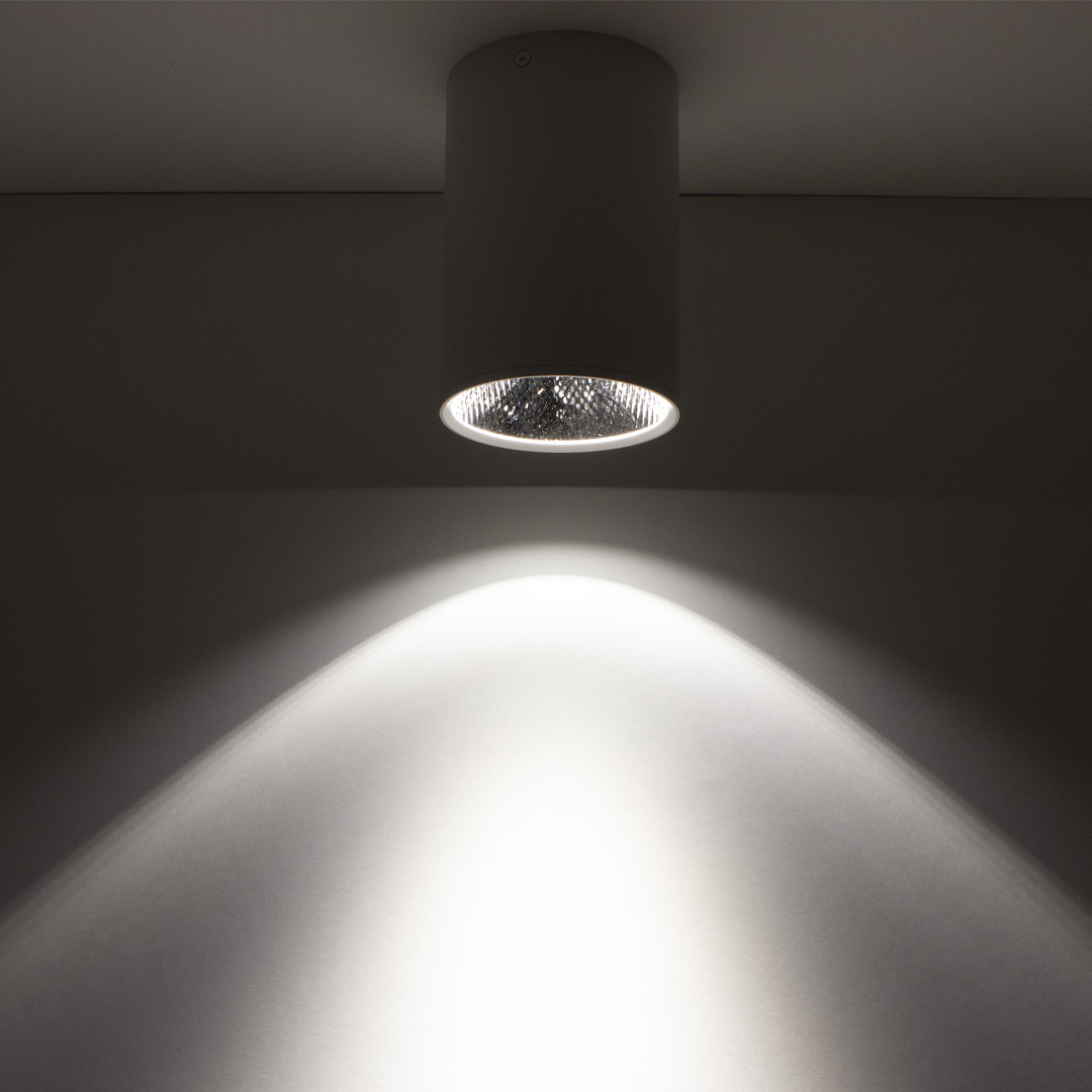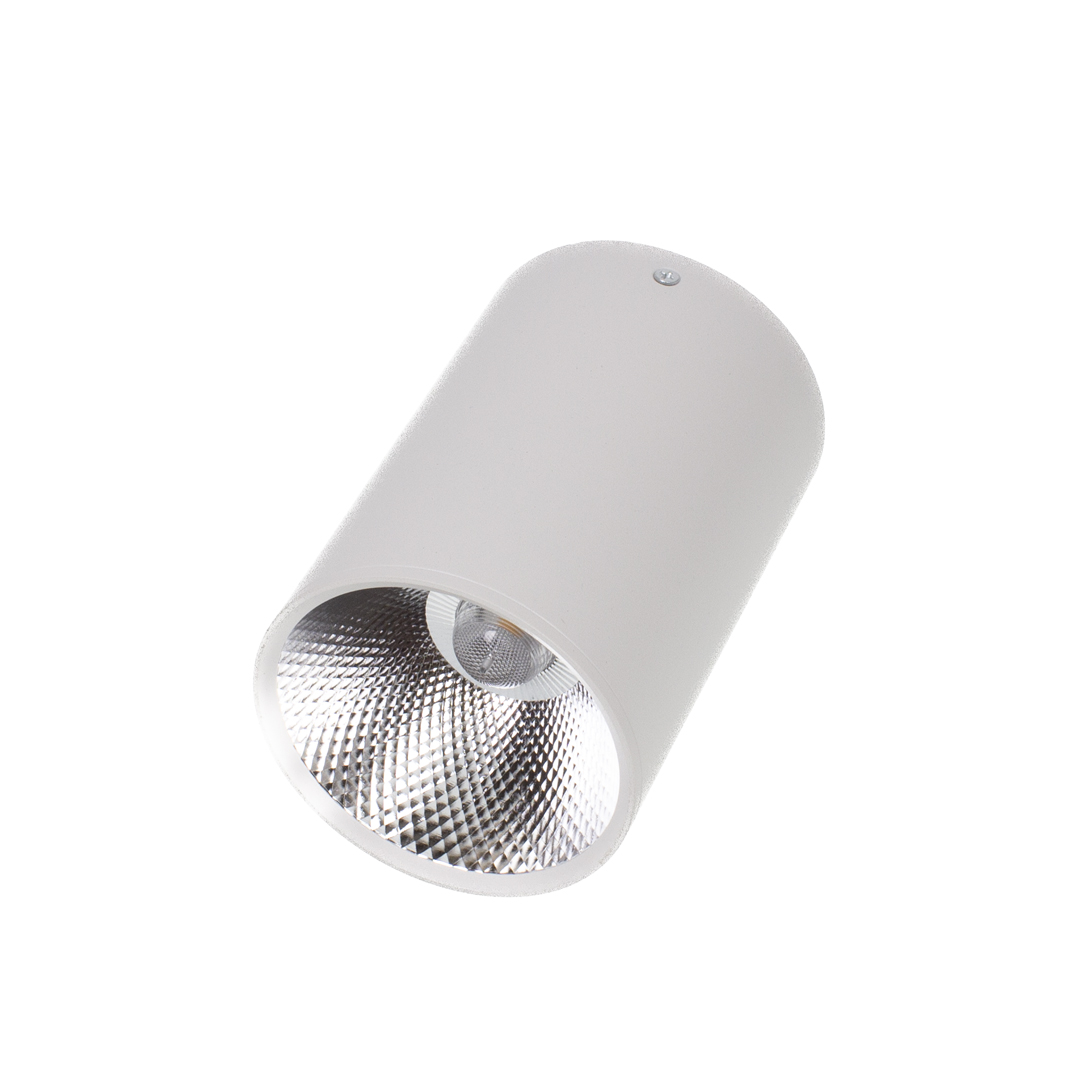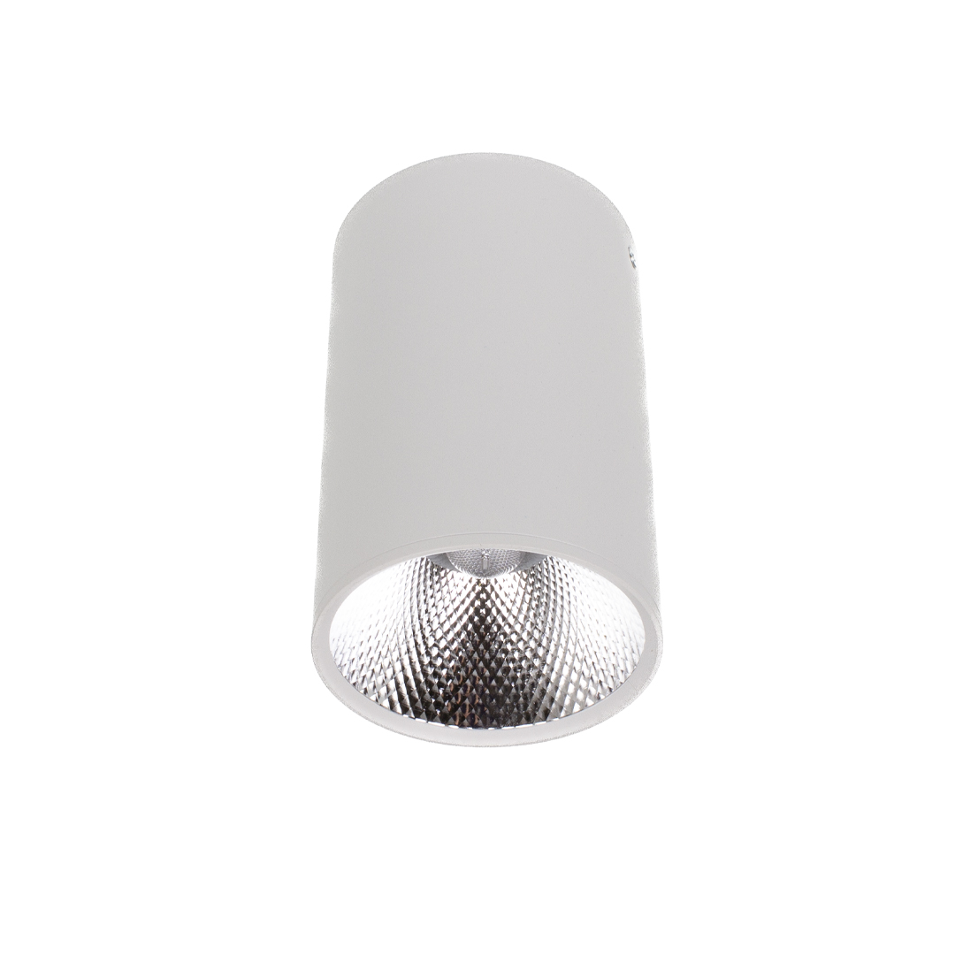 Светодиодный светильник накладной. Цилиндрический белый корпус. Напряжение 85-265V, мощность 12Вт, цвет свечения дневной белый 4000-4500K, световой поток 1080Lm. Угол свечения 30 градусов. Драйвер 24-42V, 300mA. Диаметр 100мм, высота 150мм. Размеры упаковки 100х100х155мм. Вес 450г.