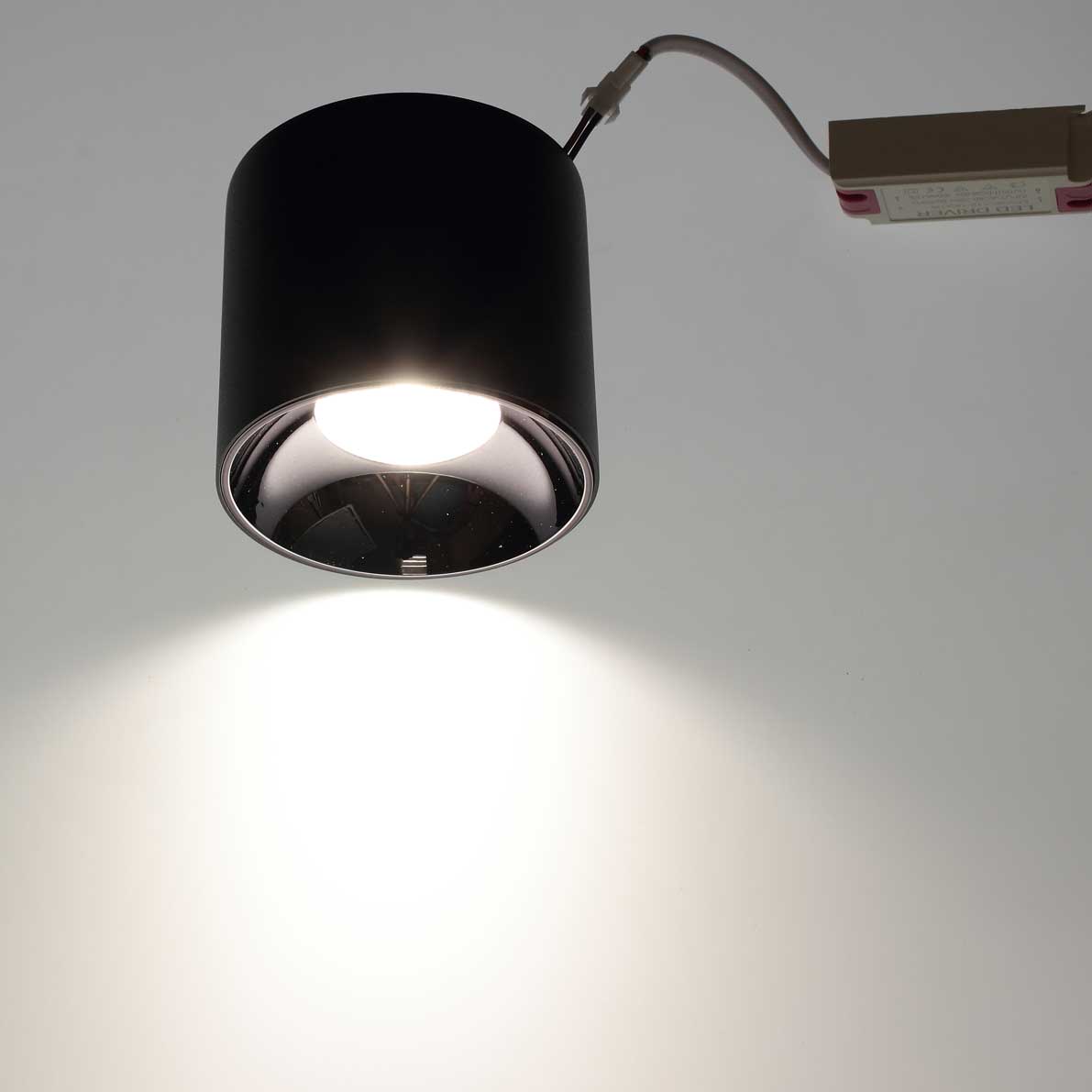Светодиодный светильник накладной. Цилиндрический черный корпус. Напряжение 85-265V, мощность 15Вт, цвет свечения белый 4000-4500K, световой поток 1350Lm. Угол свечения 90 градусов. Драйвер 36-60V, 300mA. Диаметр 98мм, высота 89мм. Вес 430гр.