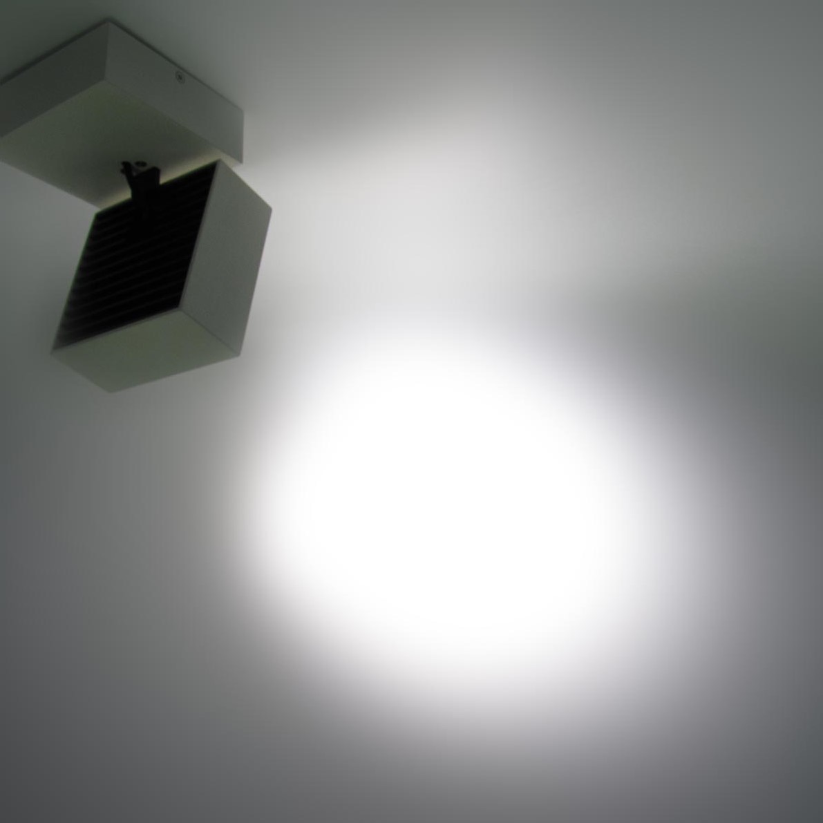 Накладной потолочный светодиодный светильник. Квадратный, белый корпус. Напряжение 110-230V, мощность 9W, цвет свечения дневной белый 4000-4500K, световой поток 1080Lm, угол свечения 45 градусов. Угол наклона до 90 градусов Размеры 100 x100 x 84 мм.