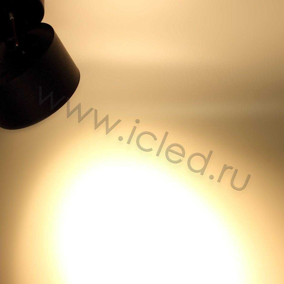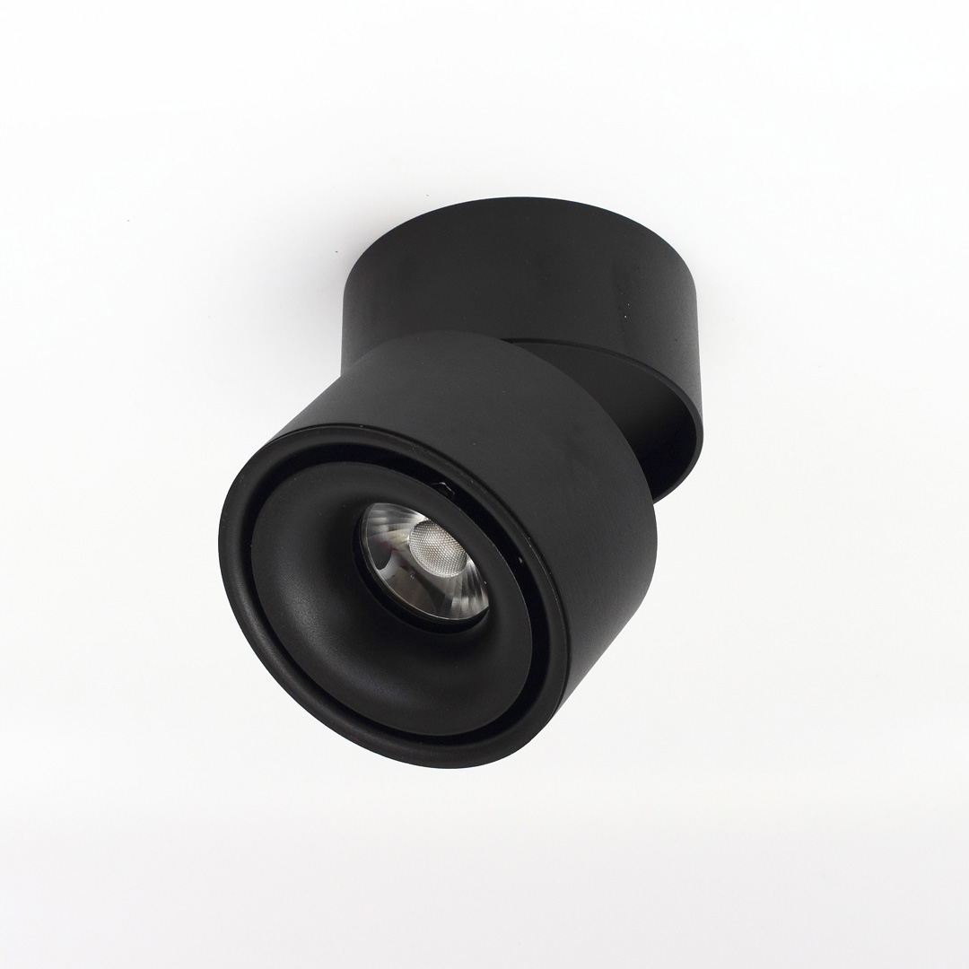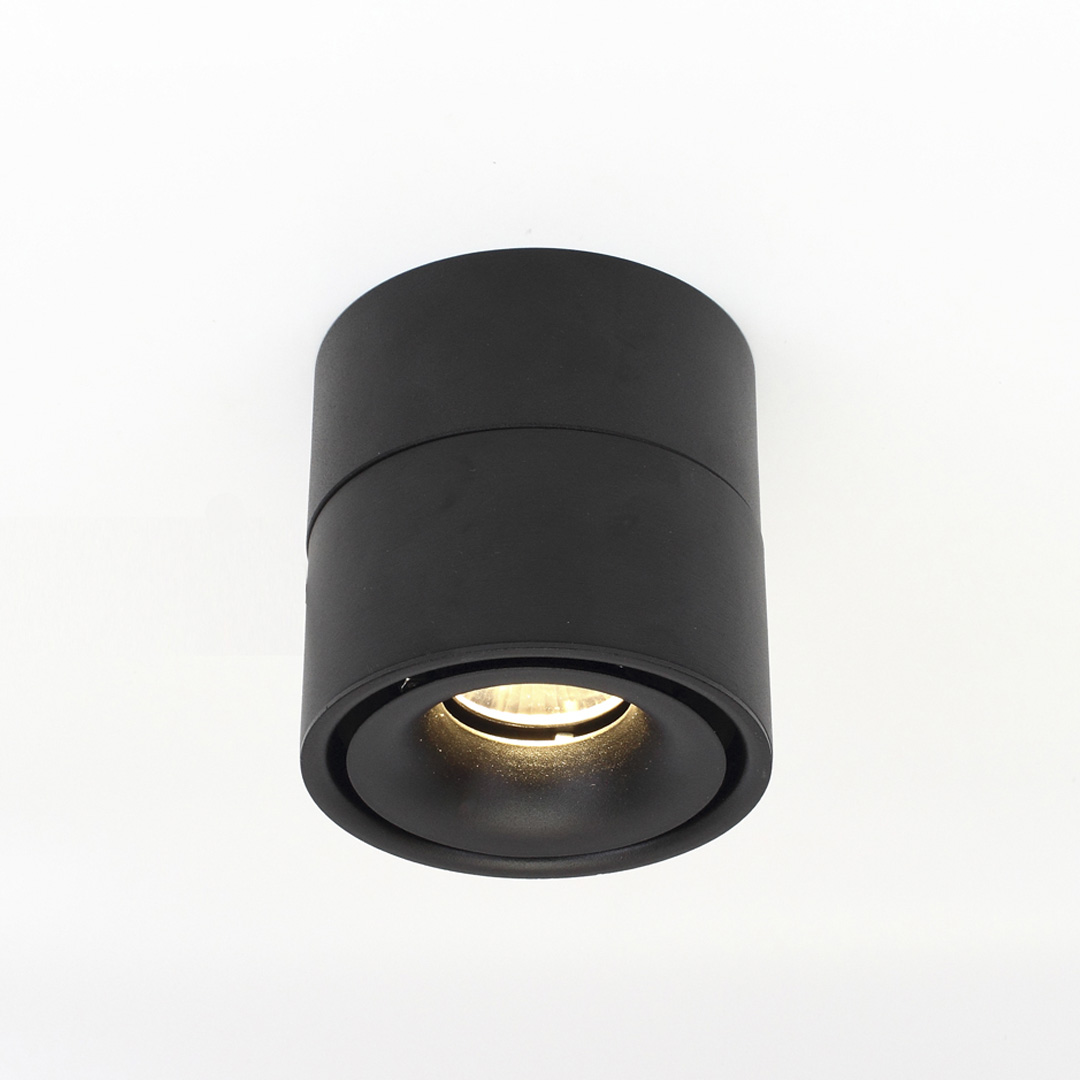 Светодиодный светильник накладной. Цилиндрический черный корпус. Напряжение 85-265V, мощность 10Вт, цвет свечения теплый белый 3000K, световой поток 1000Lm. Угол свечения 30 градусов, регулируемый угол наклона. Диаметр 100мм, высота 100мм. Вес 450г.