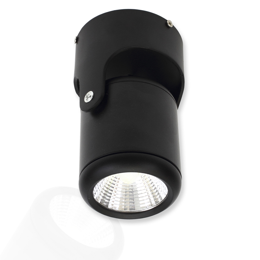 Накладной поворотный светодиодный светильник. Круглый черный корпус. Тип светодиода COB. Напряжение 85-265V, мощность 10W, цвет свечения теплый белый 3000-3500K, световой поток 900Lm, угол свечения 30 градусов. Диаметр 75мм, высота 120мм, Вес 320г.