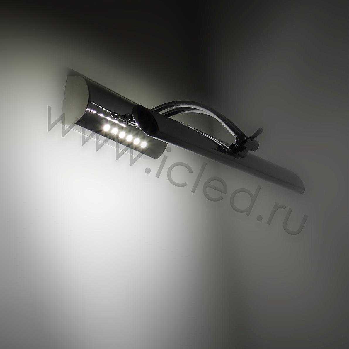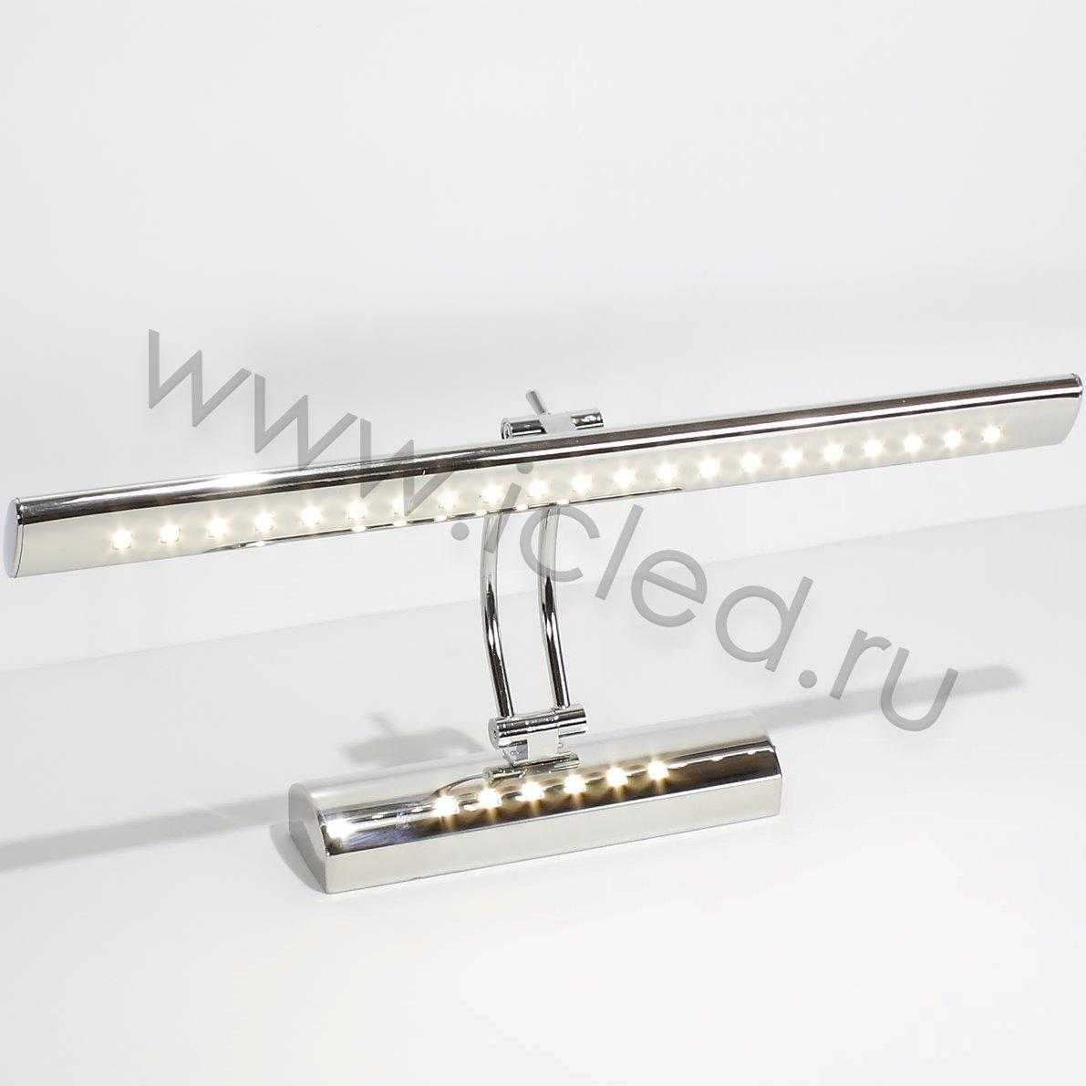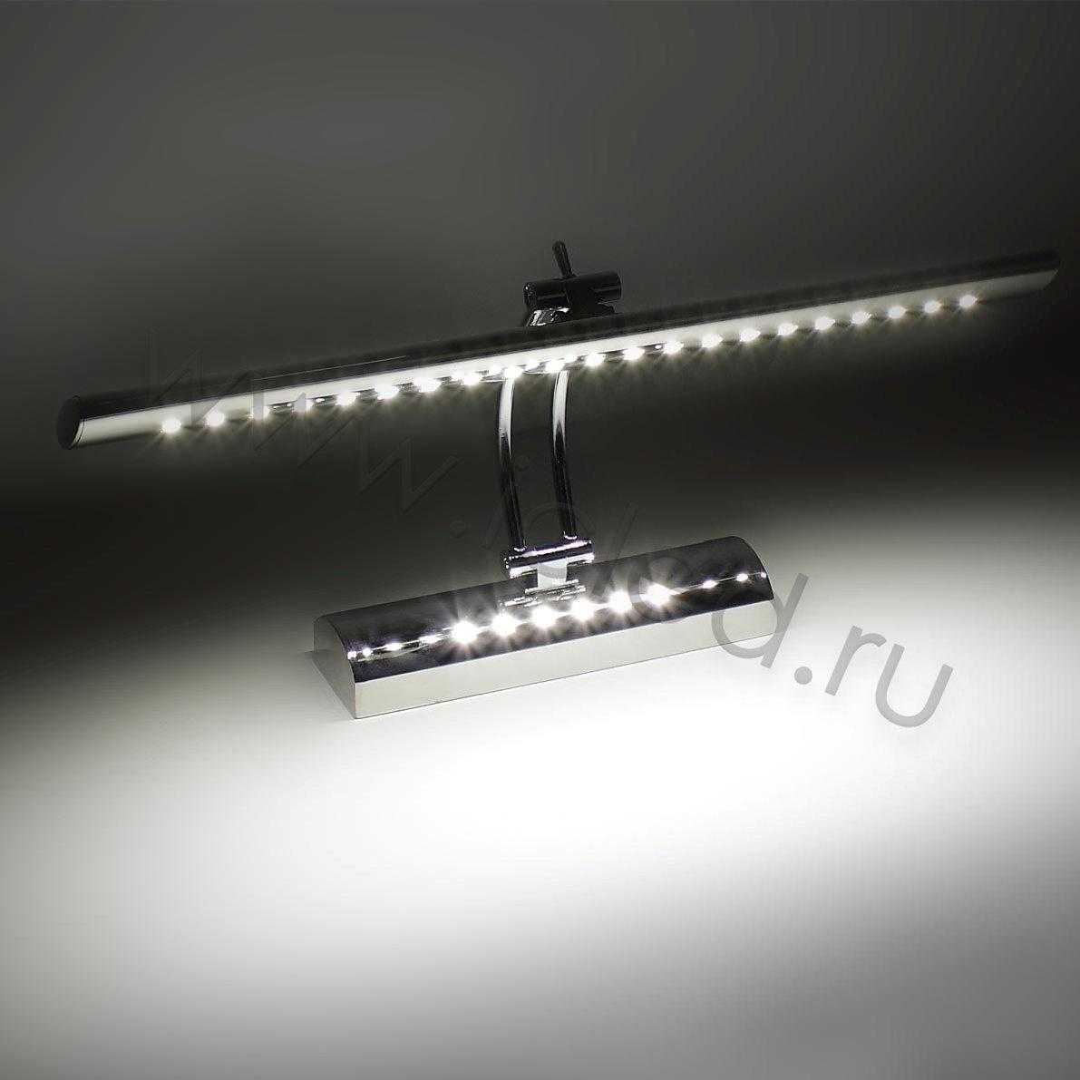 Светодиодная подсветка картин и зеркал. Напряжение 220V, мощность 5W, тип светодиода 5050 - 27 штук, цвет свечения дневной белый 4000-4500K, световой поток 350Lm, угол свечения 120 градусов, регулируемый угол наклона. Встроенный выключатель. Класс защиты IP33. Размеры 405x55x180мм.