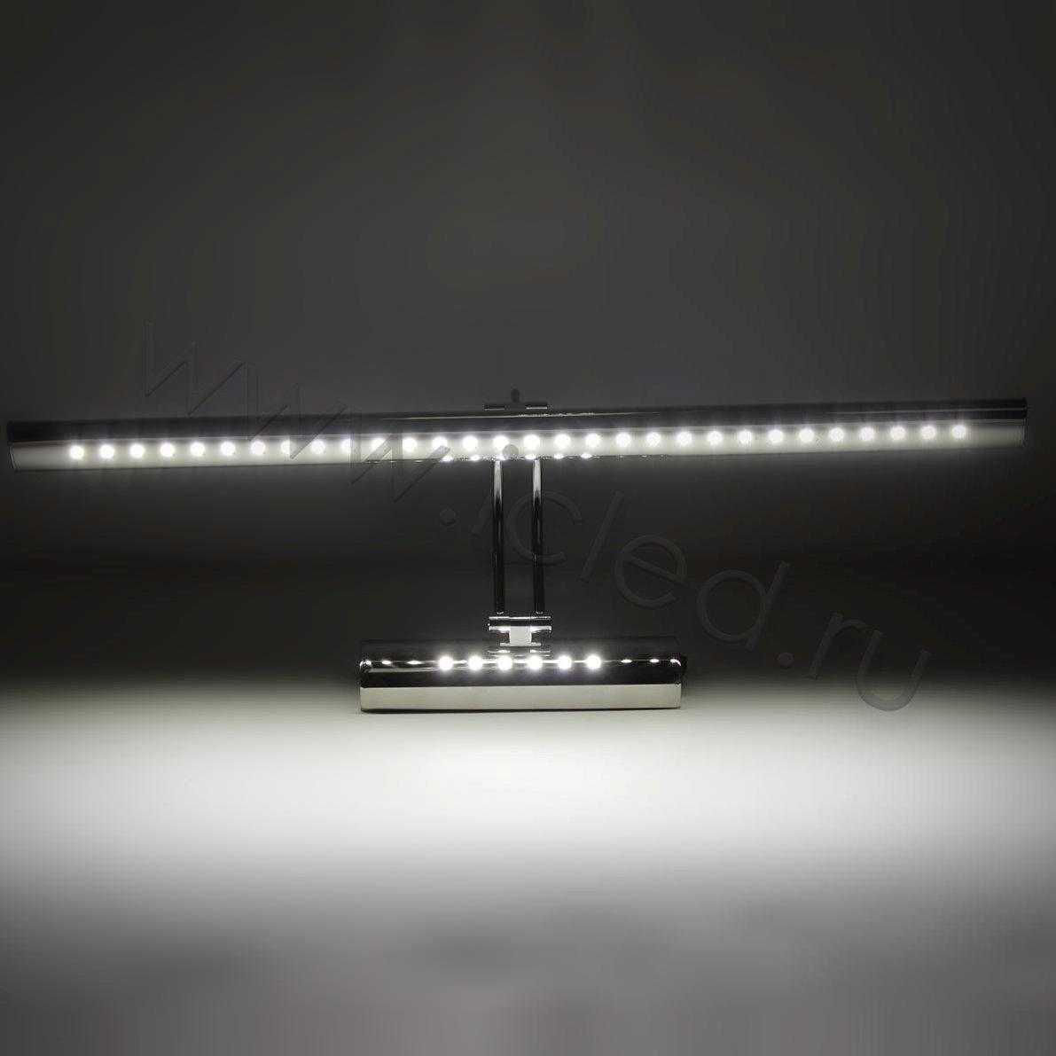 Светодиодная подсветка картин и зеркал. Напряжение 220V, мощность 7W, тип светодиода 5050 - 36 штук, цвет свечения дневной белый 4000-4500K, световой поток 490Lm, угол свечения 120 градусов, регулируемый угол наклона. Встроенный выключатель. Класс защиты IP33. Размеры 554x55x180мм.