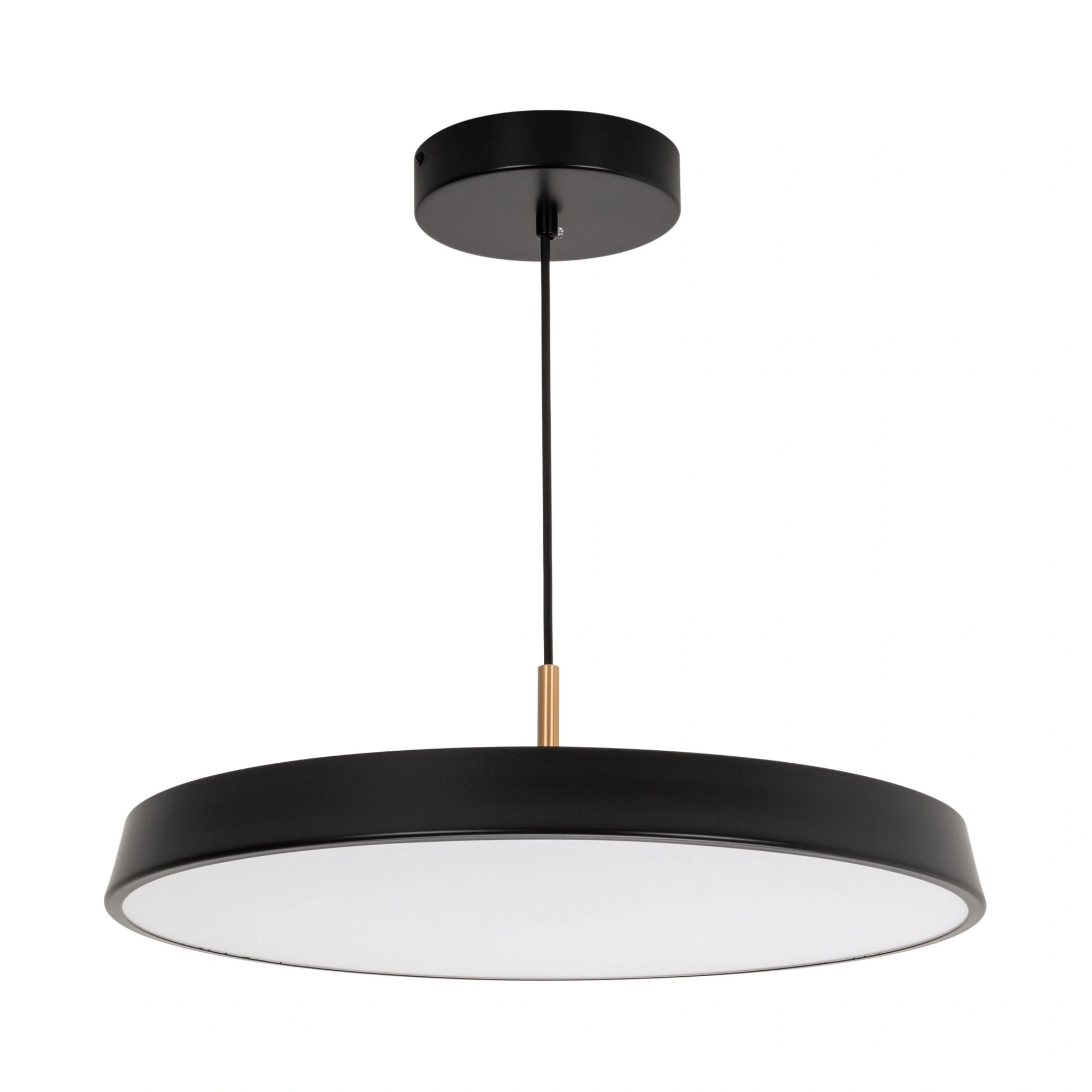 Подвесной светильник. Мощность 37 Вт, св. поток 3071 лм, 83 лм/Вт, теплый 3000 K, CRI>80, угол 120°, напряжение питания 230 В. Черный круглый корпус из стали, экран PMMA, степень защиты IP20. Размер: диаметр 500 мм, высота 50 мм, размер чаши: диаметр 160 мм, высота 35 мм. Монтаж подвесной, длина подвеса 1200мм.