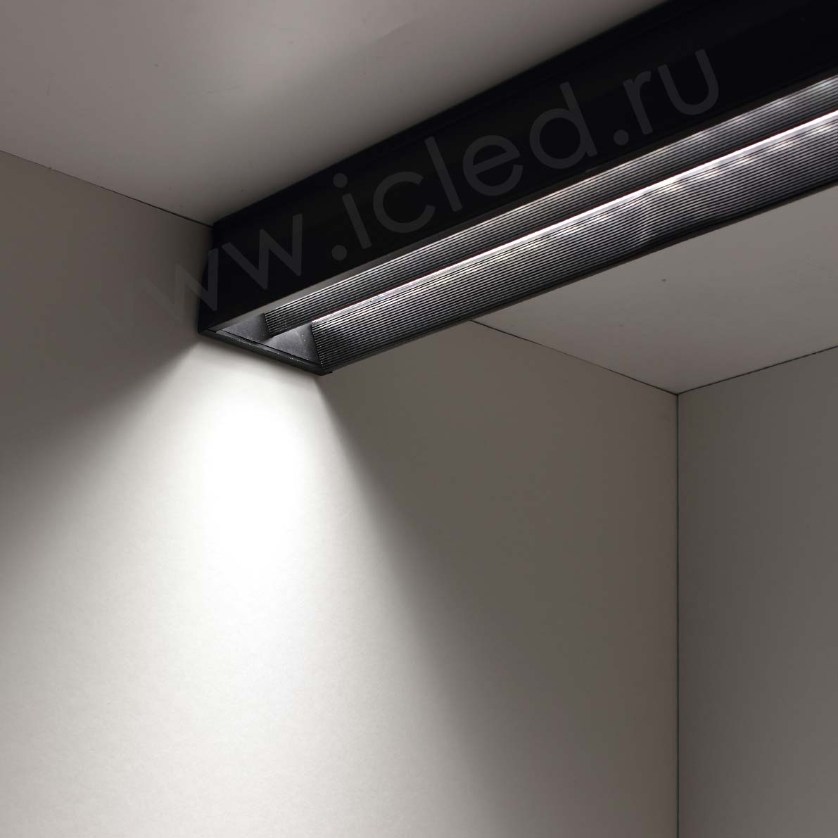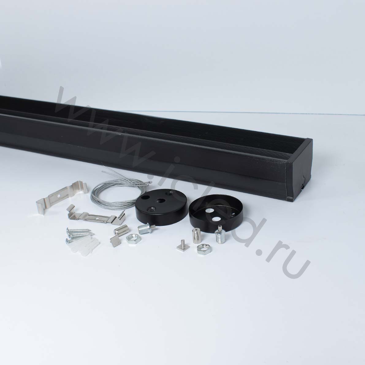 Линейный светодиодный светильник. Черный пластиковый корпус. Напряжение 85-265V, мощность 50W, цвет свечения дневной белый 4000K, световой поток 5000Lm, угол свечения 30 градусов. Класс защиты IP40. Размеры 1173x70x52мм. Длина провода 1100мм. Максимальная длина регулируемого подвеса 1200мм.