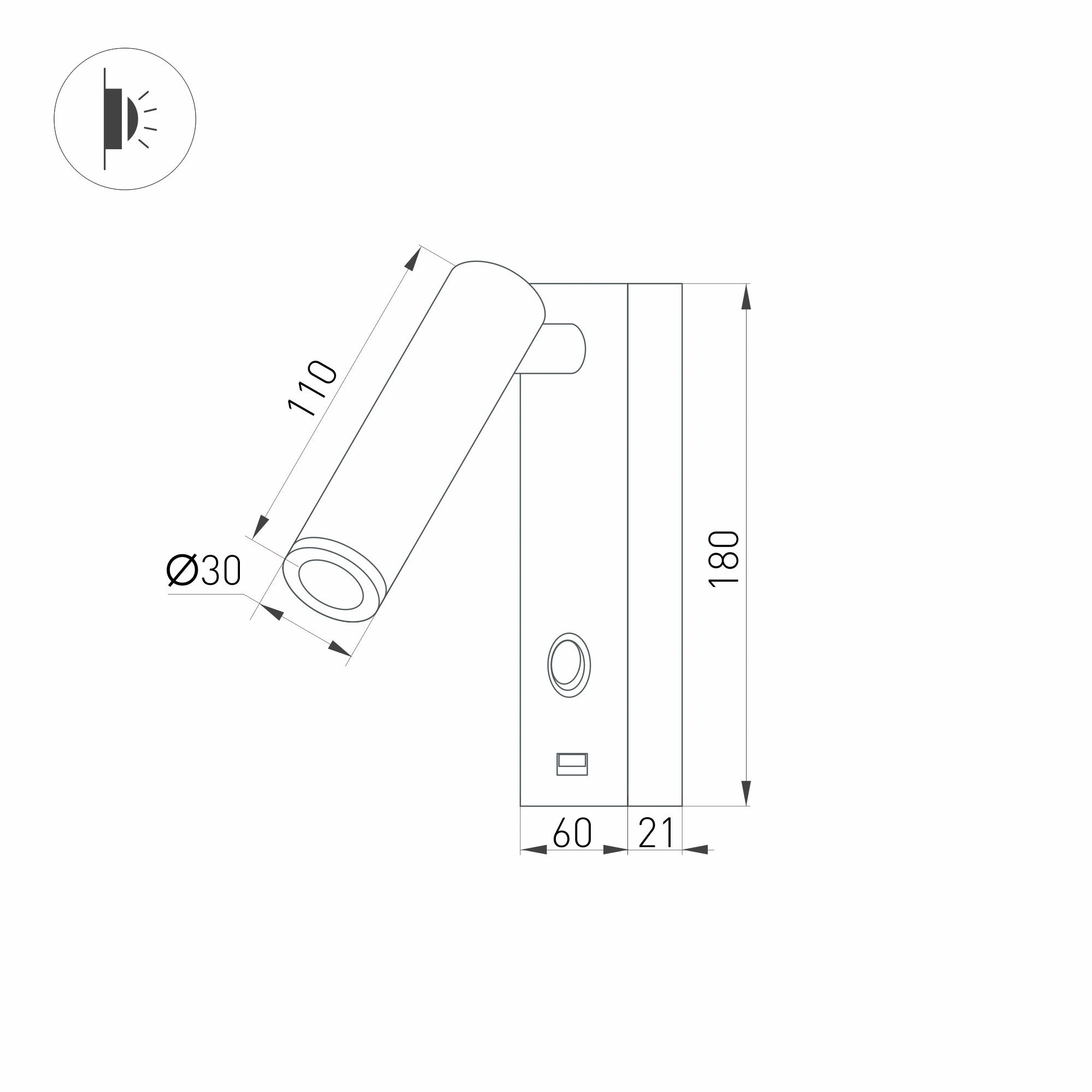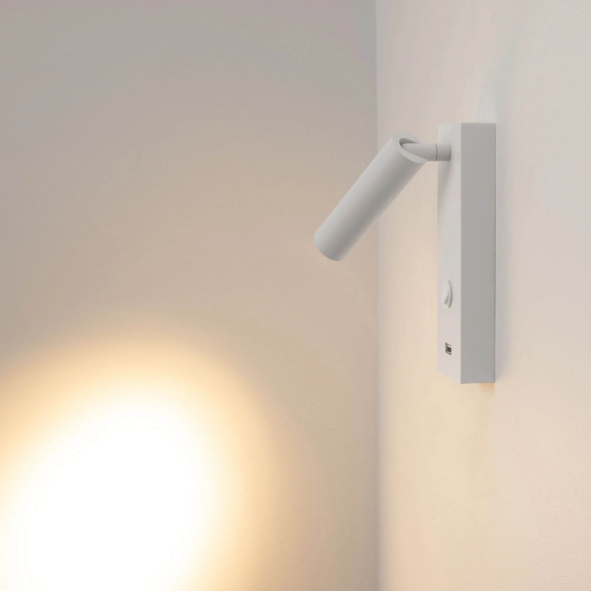 Накладной настенный светильник 3Вт, белый алюминиевый корпус. Цвет ТЕПЛЫЙ БЕЛЫЙ 3000K, св.поток 200лм, CRI(Ra)>80, угол 20°. Размер Основание 180х60х21мм, Светоизлучатель Ø30×110 мм. IP20. Питание AC220-240V, 3Вт, встроенный драйвер. Встроенный USB порт для зарядки.