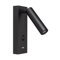 Накладной настенный светильник 3Вт, чёрный алюминиевый корпус. Цвет ТЕПЛЫЙ БЕЛЫЙ 3000K, св.поток 200лм, CRI(Ra)>80, угол 20°. Размер Основание 180х60х21мм, Светоизлучатель Ø30×110 мм. IP20. Питание AC220-240V, 3Вт, встроенный драйвер. Встроенный USB порт для зарядки.