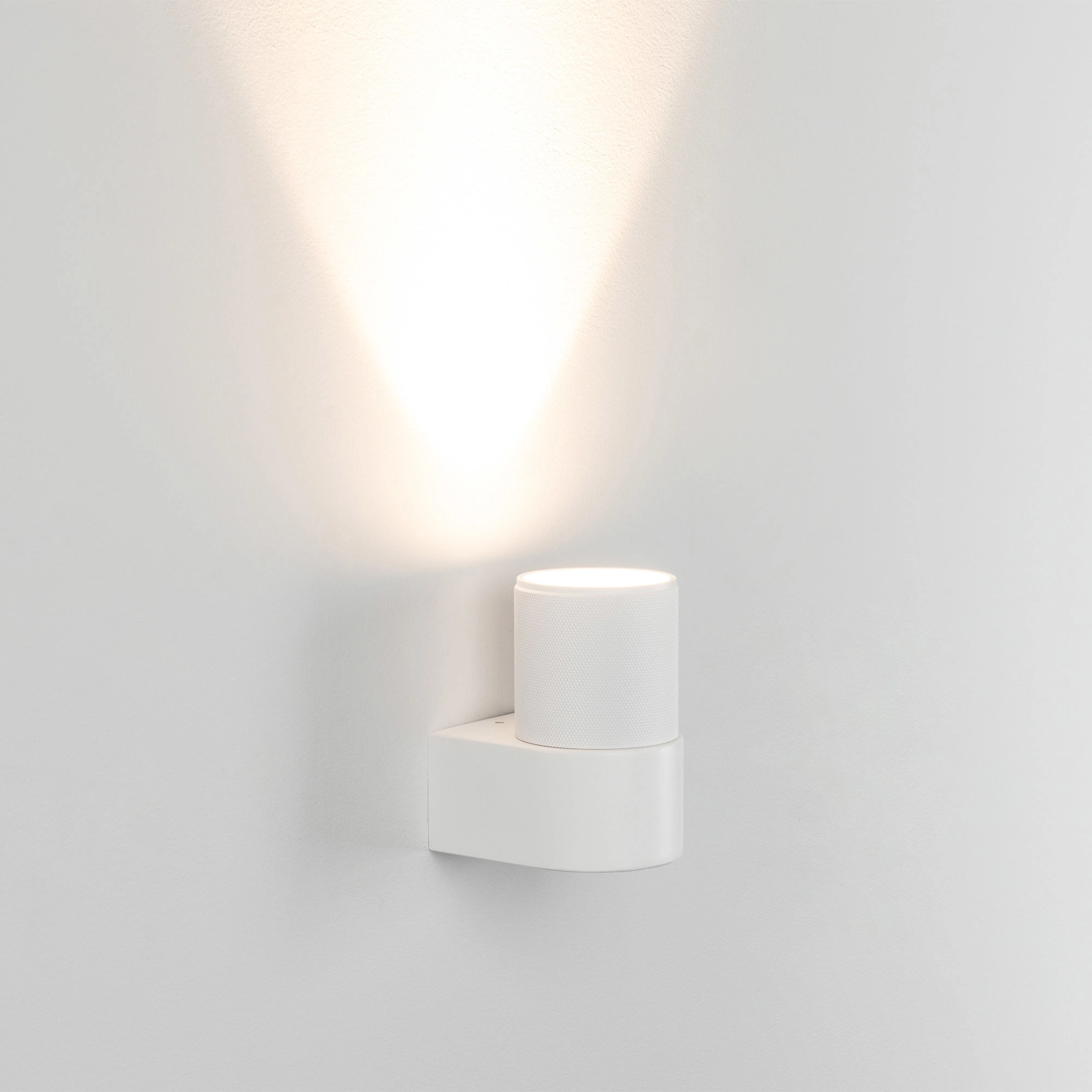 Настенный светильник со свечением вверх или вниз. Мощность 6 Вт, св. поток 360 лм, 55 лм/Вт, теплый 3000 K, CRI>90, угол 40°, напряжение питания 230 В. Белый фигурный корпус из алюминия, степень защиты IP20. Размер: длина 110 мм, ширина 72 мм, высота 115 мм. Монтаж накладной. Драйвер 26-40 В, 150 мА, пульсация <1%.