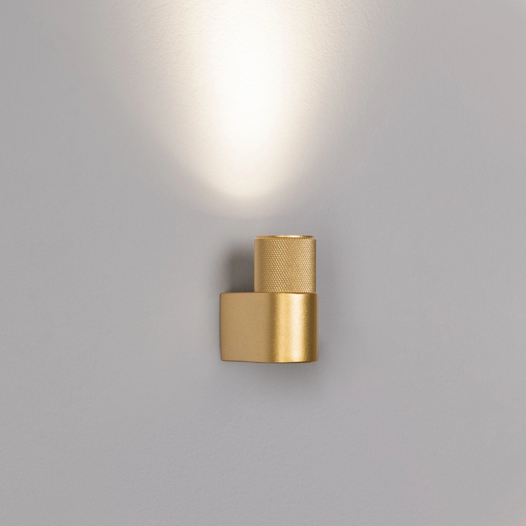 Настенный светильник со свечением в верхнюю или нижнюю полусферу. Мощность 3 Вт, св. поток 175 лм, 55 лм/Вт, дневной 4000 K, CRI>90, угол 40°, напряжение питания 230 В. Золотой фигурный корпус из алюминия, степень защиты IP20. Размер: длина 60 мм, ширина 38,5 мм, высота 62 мм. Монтаж накладной. Драйвер 1,8-4 В, 700 мА, пульсация <1%.